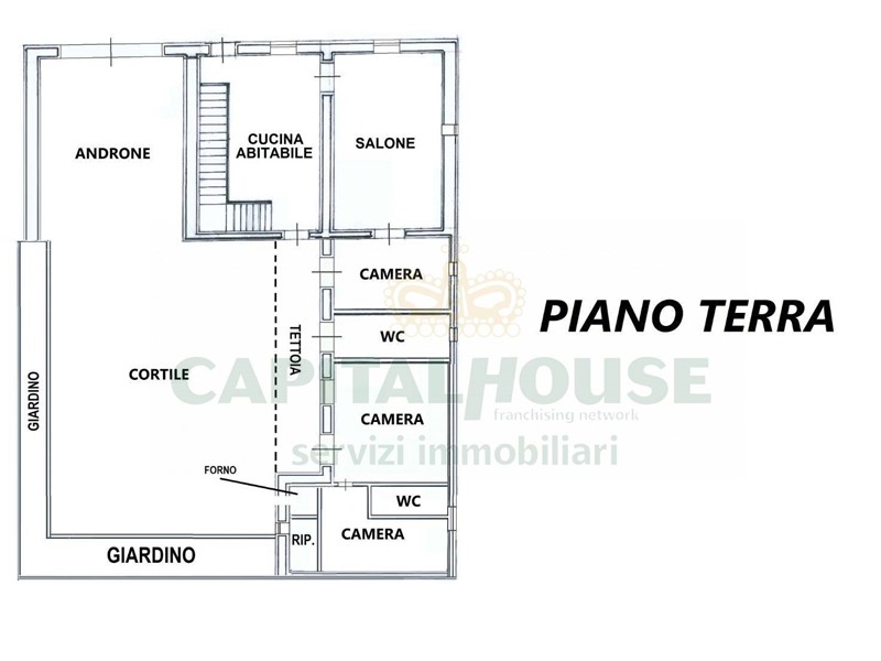 -piano terra: (120mq) cucina abitabile, salone, 2 bagni, ripostiglio, forno, cortile di 145mq e giardino di 25mq;