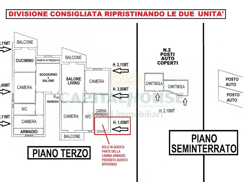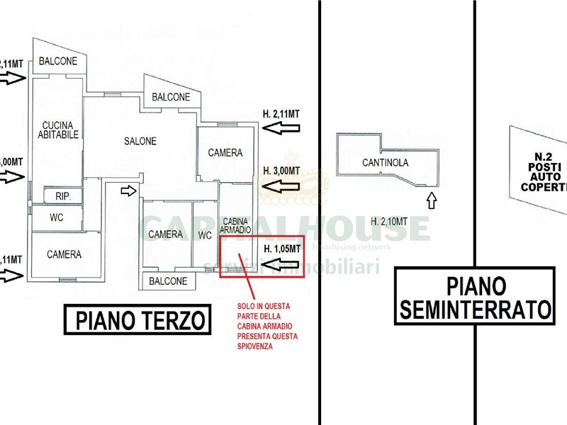 -Altezze della mansarda: punto alto al centro 3,00 metri; nelle parti più esterne si abbassa a 2,11metri e solo in cabina armadio scende a 1,05metri. Per maggiori informazioni visionare la foto n. 2 del presente annuncio;