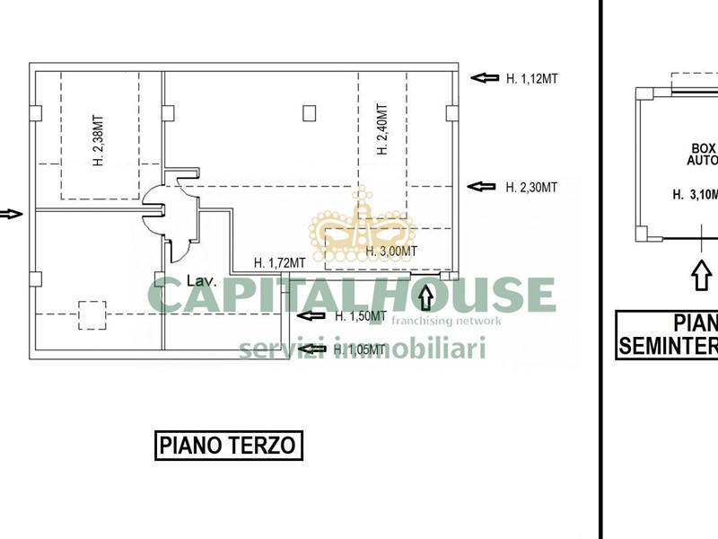 -piano seminterrato: box auto di 20mq (CALPESTABILI) con h. 3,10mt;