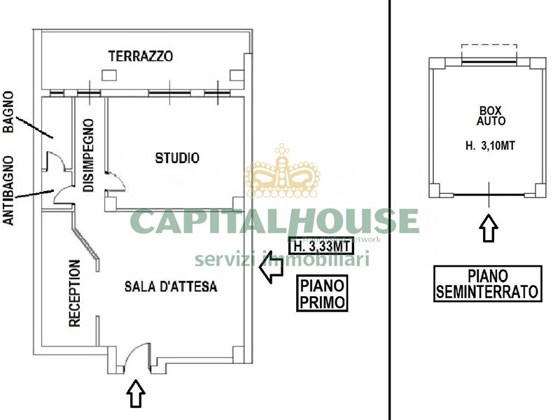 -piano seminterrato: box auto (di 20mq CALPESTABILI) con h. 3,10mt;