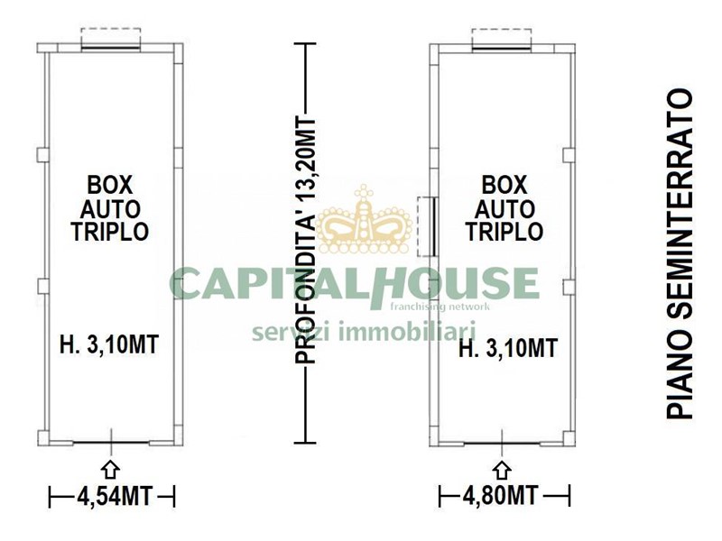 -piano seminterrato: 2 box auto (per totali 120mq CALPESTABILI) con h. 3,10mt, serranda motorizzata;