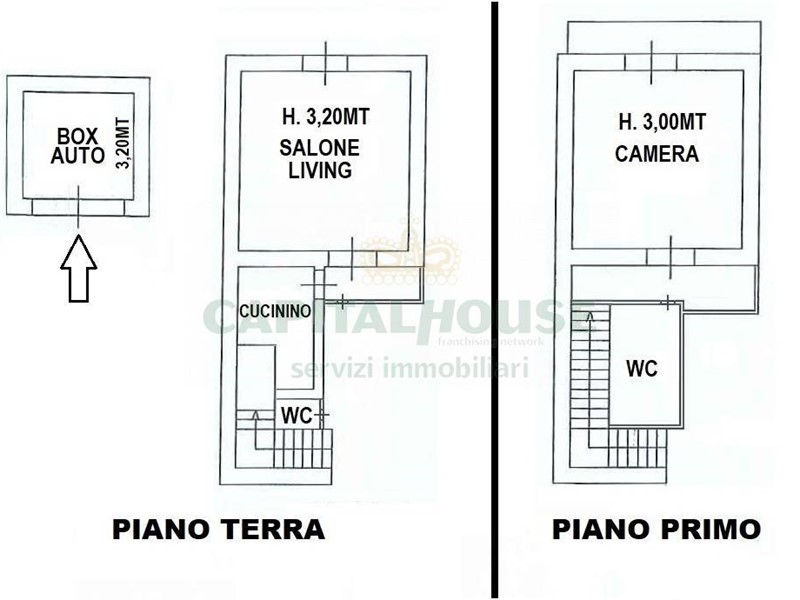 -piano terra: (40MQ INTERNI CALPESTABILI) cucinino, salone living, bagno, box auto di 11mq e posto auto in corte comune;