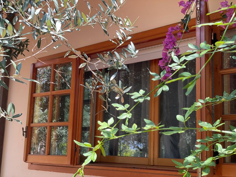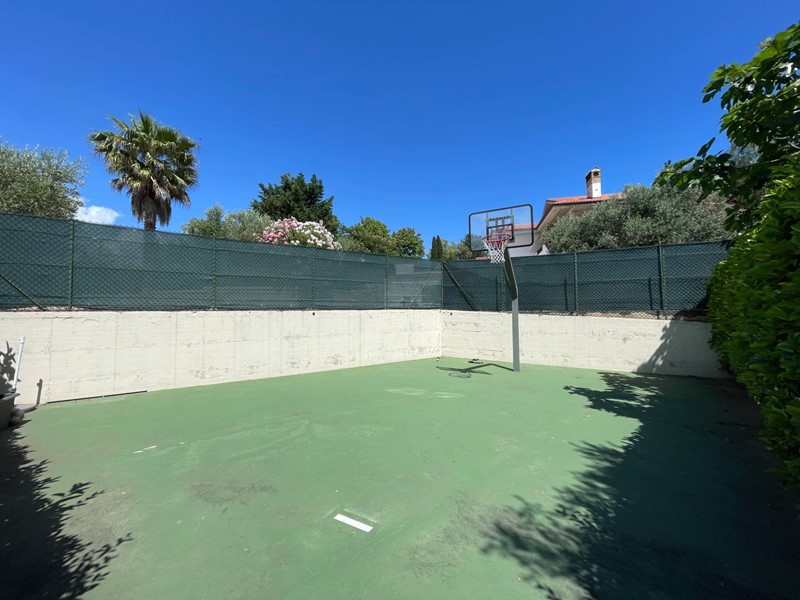 All'esterno il giardino presenta varie zone relax, tra cui l'area della piscina, il piccolo campo da pallacanestro, i pergolati attrezzati e diversi alberi di ulivo e da frutta.