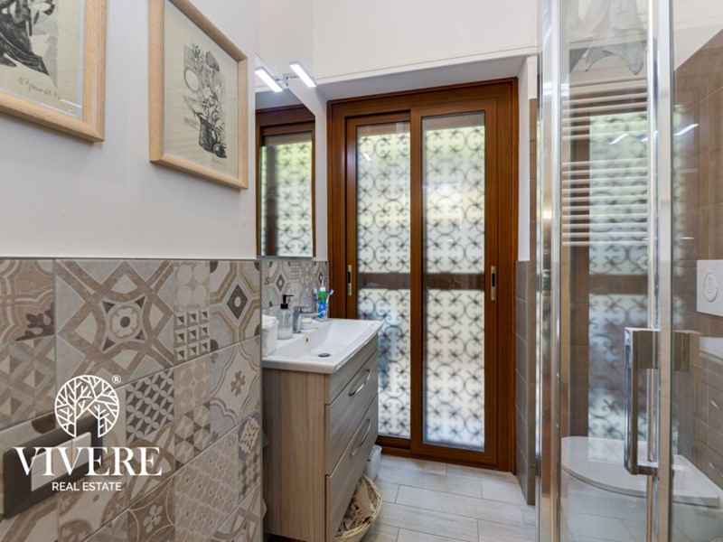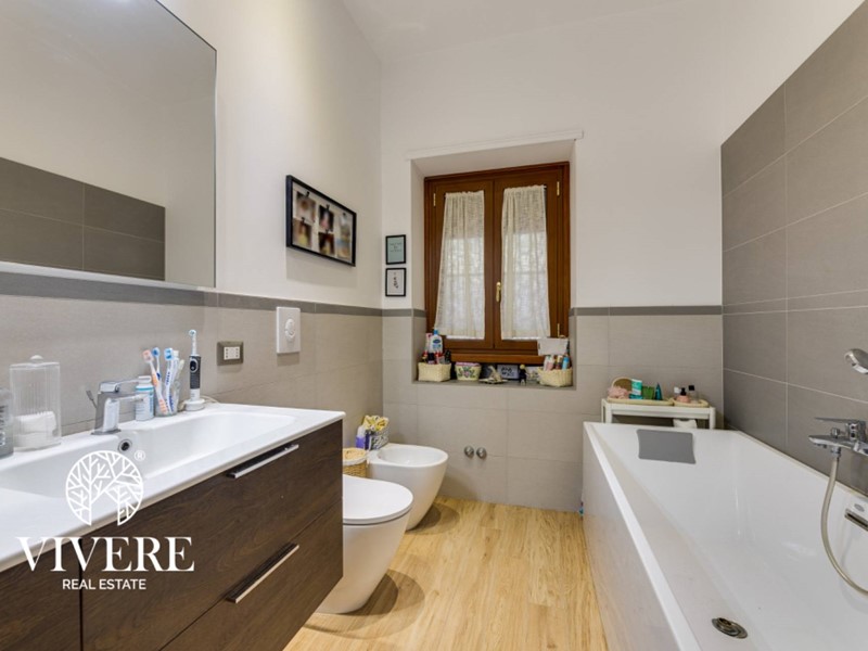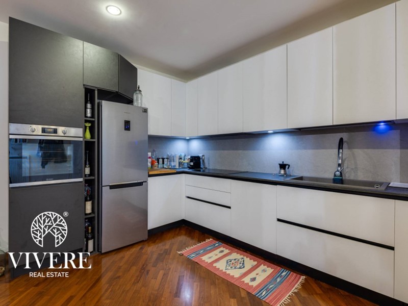 L'appartamento è ben suddiviso ed è composto da un ingresso, un salone doppio provvisto di camino e una bellissima e ampia cucina a vista di c.a 50mq. Una grande camera doppia, un comoda camera matrimoniale, due servizi. Completa la proprietà un giardino pavimentato di c.a 80 mq che circonda tutta l'abitazione ed è accessibile da ogni ambiente. L'immobile, risulta climatizzato e dotato di un ottimo sistema di allarme volumetrico e perimetrico, ha una doppia esposizione con affacci aperti che lo rendendolo arioso e silenzioso.