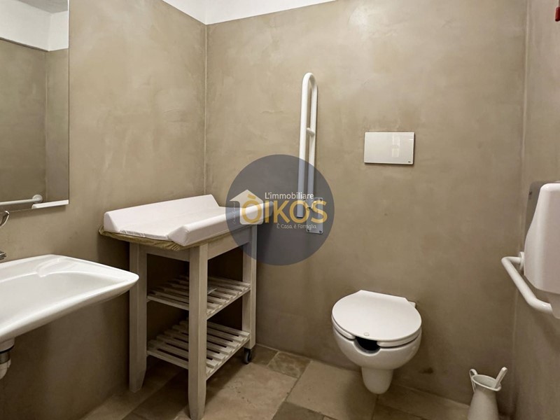 Sono due i bagni per i clienti, uno con accesso per disabili, preceduti dall antibagno dotato di porta scorrevole con lavabo sospeso su piano in legno posto in ambiente raffinato.