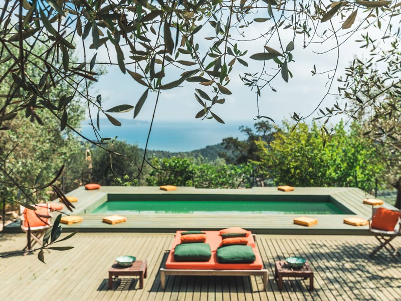 È presente in posizione riservata una piccola piscina esterna, in pvc, di 7 x 3 metri, rivestita di legno e verniciata verde salvia, con uno spaziosissimo prendisole, con pergola amovibile dotata di ruote