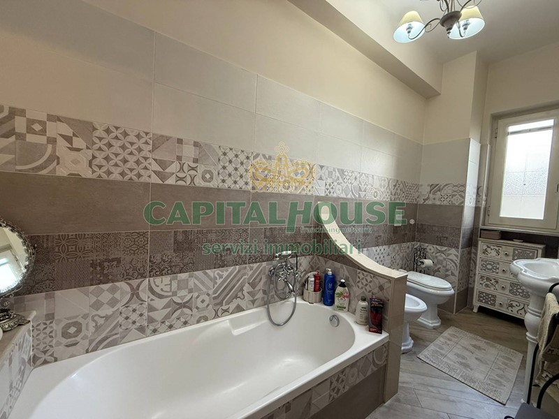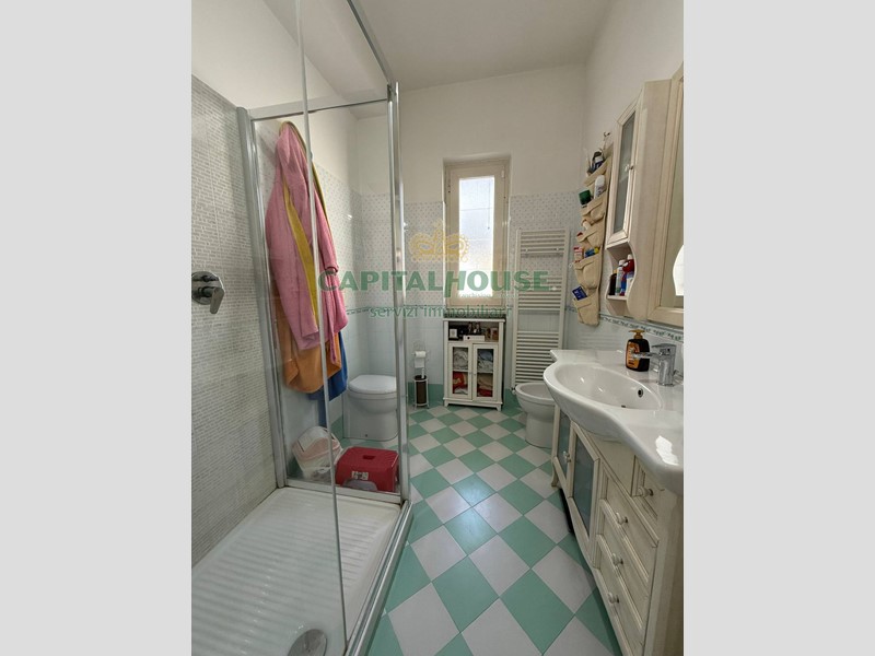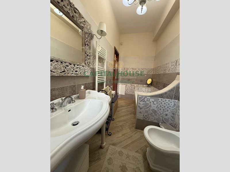zona giorno con ingresso in ampio salone, cucina abitabile con Idro-camino e bagno con vasca dal design unico; dal salone abbiamo una bellissima scala in marmo che porta alla zona notte caratterizzata da ampio corridoio con armadio a muro artigianale, due camere da letto, di cui una con ripostiglio, camera matrimoniale e bagno con ampio piatto doccia e lavanderia.