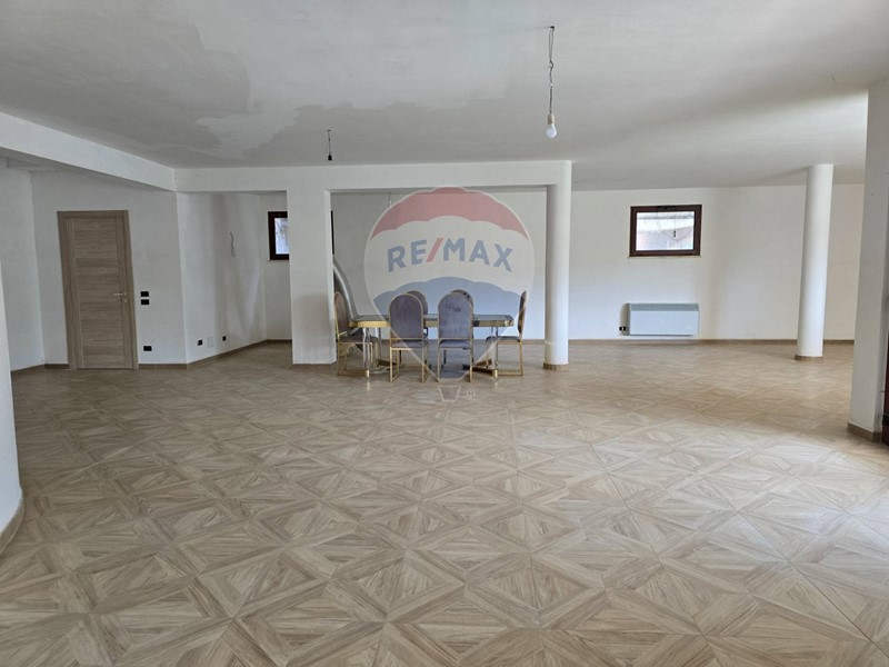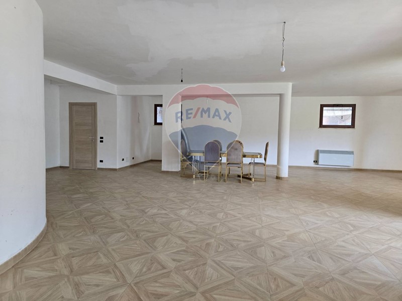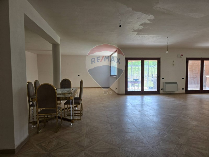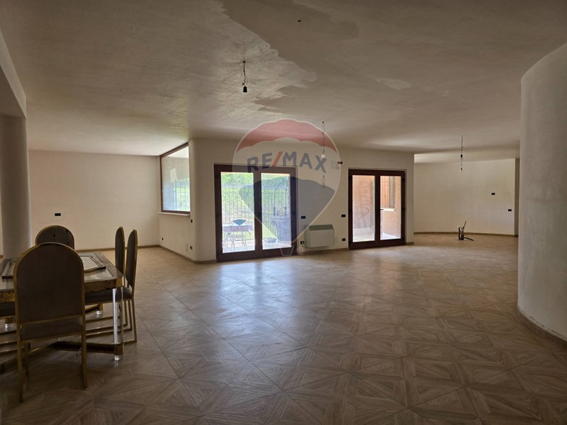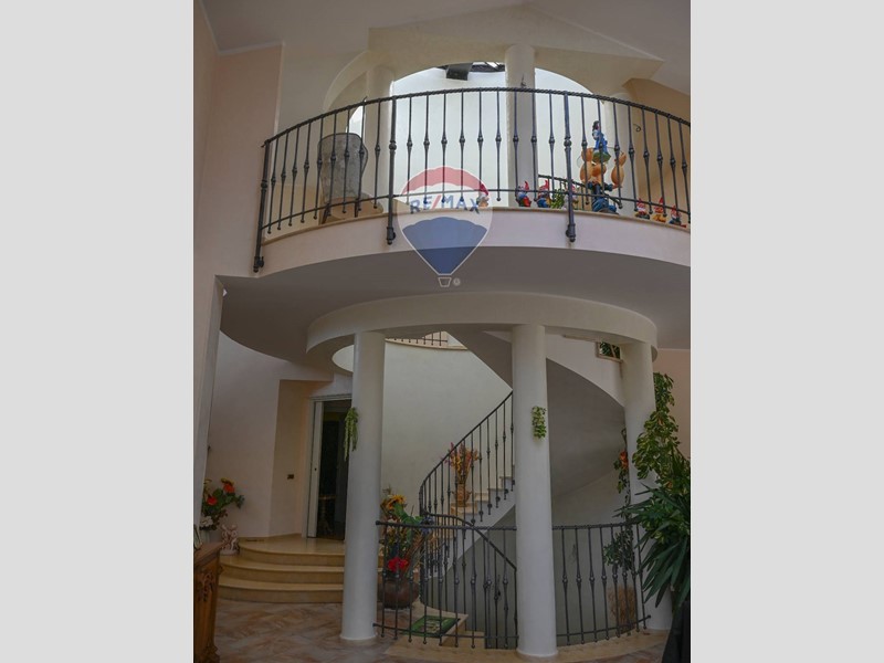 L'ingresso principale si apre su un ampio soggiorno, con una scala elicoidale stupenda dove si può raggiungere il piano superiore, ancora da completare, ma con impianti già predisposti, e la taverna collegata ai garage.