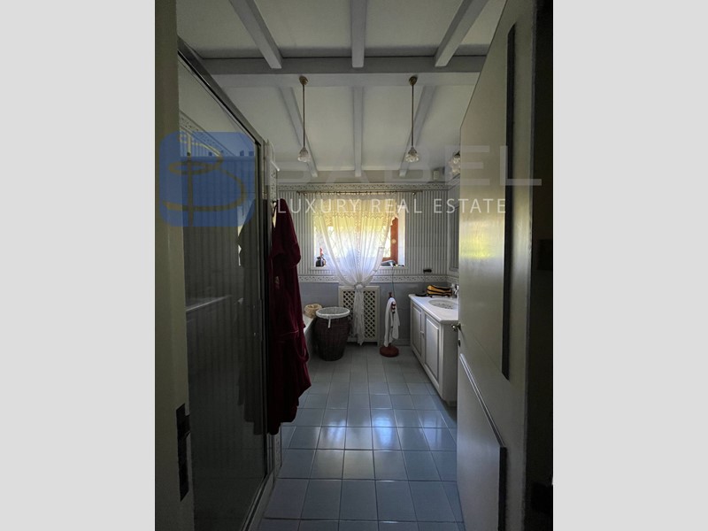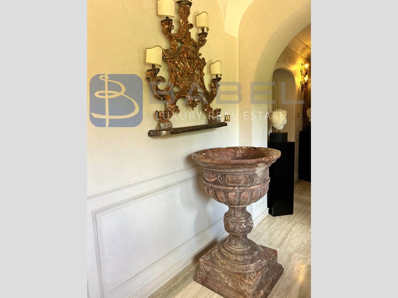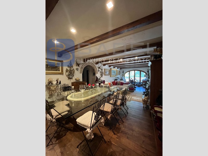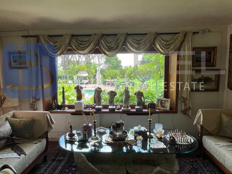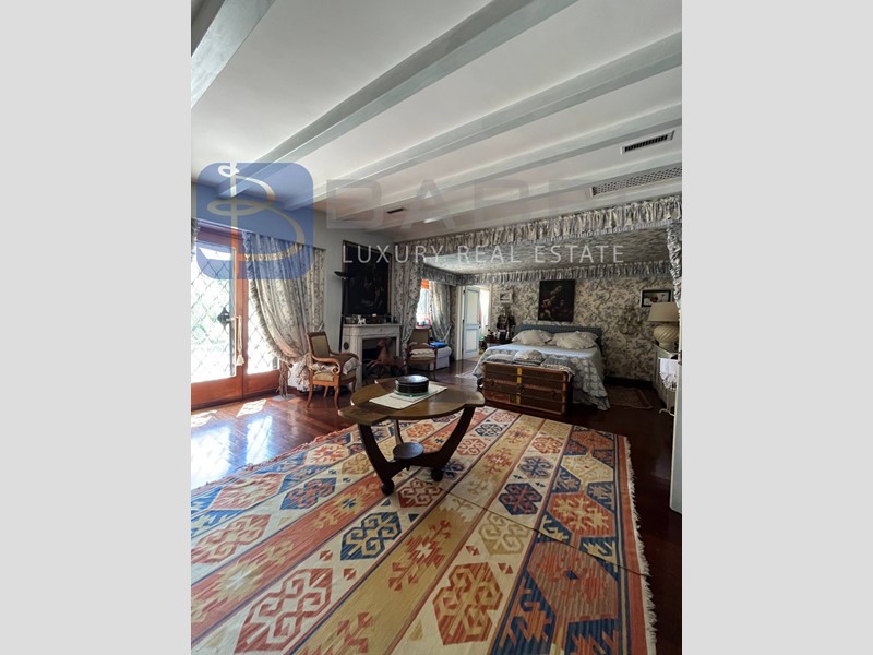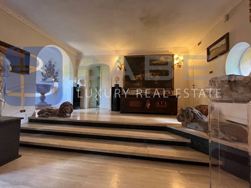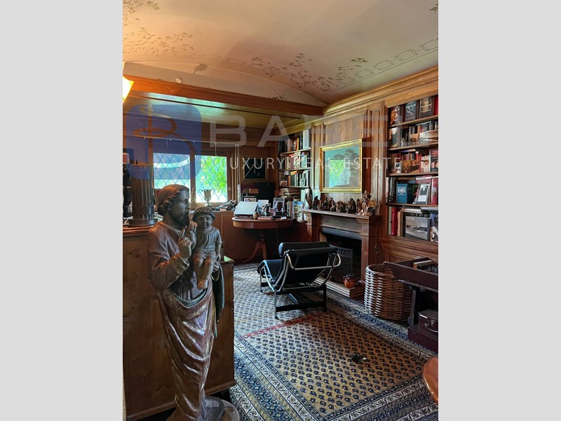 Con una superficie interna totale di 543 mq, questa villa prestigiosa si sviluppa su un lieve dislivello e offre diversi ingressi al piano terra. L'elegante ingresso principale conduce al salone di rappresentanza con annessa biblioteca, camino e librerie in boiserie originale, e alla sala da pranzo, entrambi con ampie vetrate e accesso alla terrazza sulla piscina.