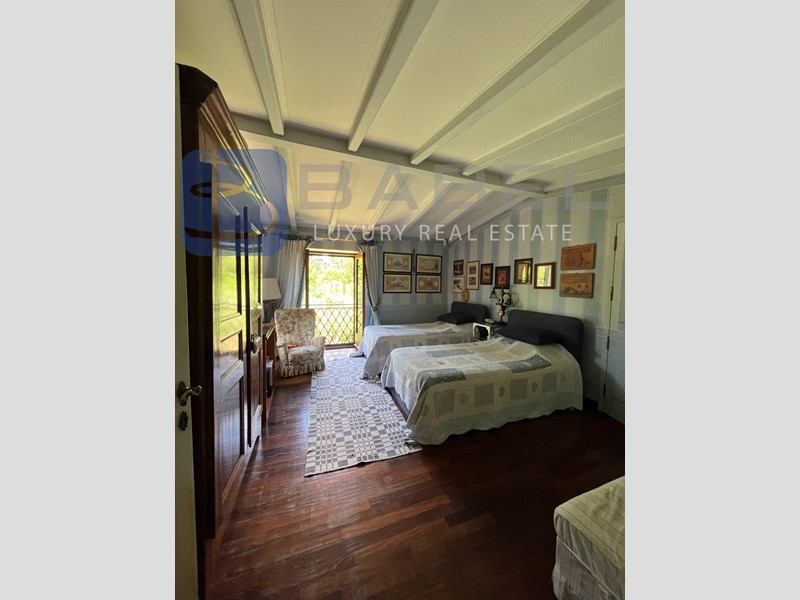 La zona notte, situata sullo stesso piano principale, comprende 3 camere da letto (la camera padronale con camino) con bagni en-suite e un'altra camera con due spaziose terrazze panoramiche al piano superiore. Al piano terra, tramite un altro ingresso, si trova una grande cucina completamente attrezzata con locali di servizio annessi (camera, cucinino e bagno con ingresso indipendente) e un ampio magazzino. Sullo stesso piano si trova anche un ulteriore salone triplo con terrazza, cantinette e servizi.