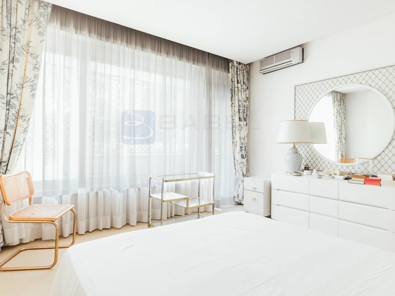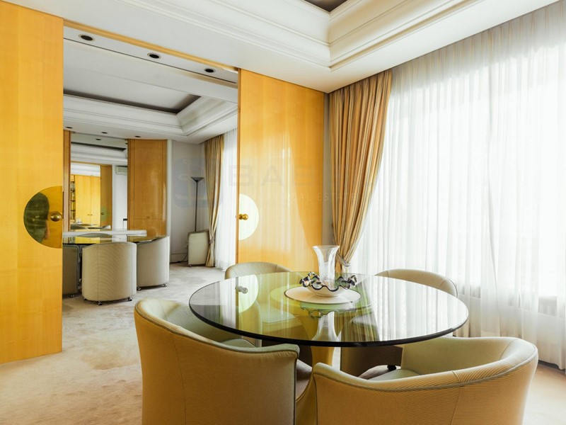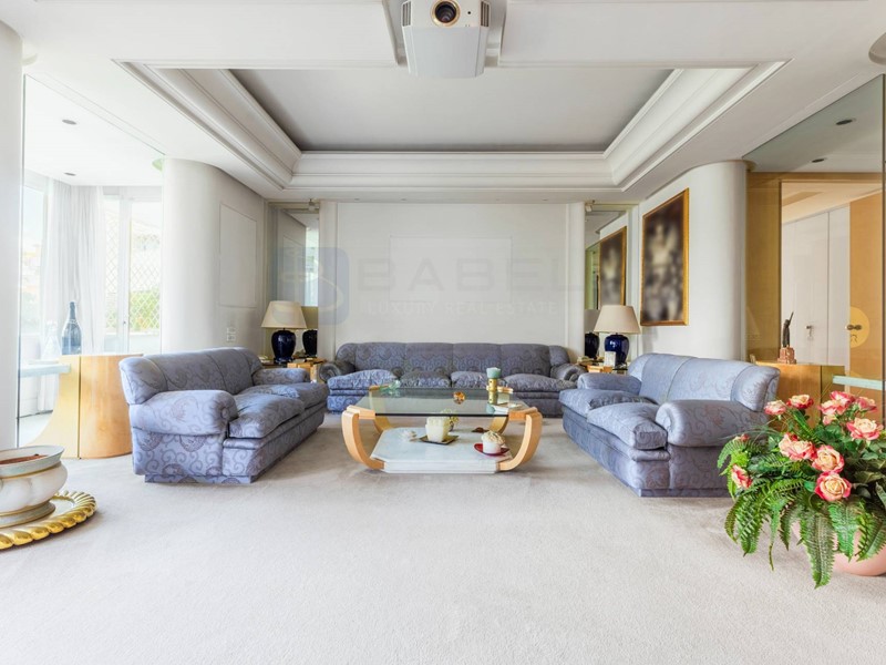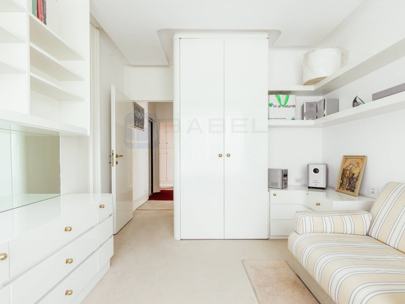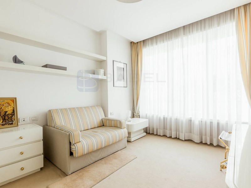 Lappartamento si presenta con una distribuzione molto funzionale: tre ingressi, un salone triplo di grande rappresentanza, doppia sala da pranzo, quattro camere matrimoniali ciascuna dotata di ampi armadi a muro, e quattro bagni, di cui due en-suite. Uno dei bagni padronali include anche una sauna. La cucina è spaziosa e ben attrezzata, con doppio piano di lavoro, doppi piani cottura e ogni comfort necessario. Completano la proprietà ampi terrazzi perimetrali che circondano limmobile, un box/lavanderia e un posto auto coperto. Limmobile con riscaldamento centralizzato è dotato anche di impianto autonomo di raffreddamento/riscaldamento di aria condizionata, per garantire il massimo comfort tutto lanno.