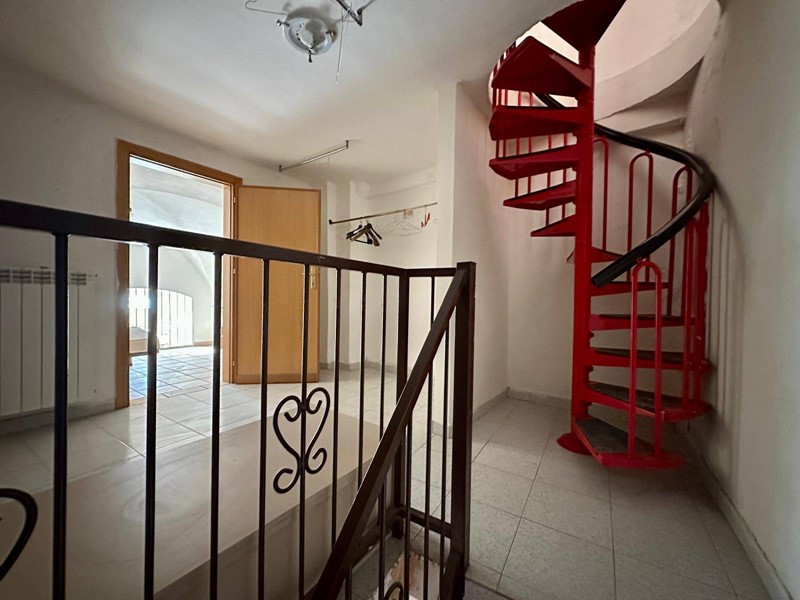 Una scala a chiocciola ci conduce al piano inferiore dove troviamo un disimpegno e una camera matrimoniale rifinita con soffitto con volte a croce.