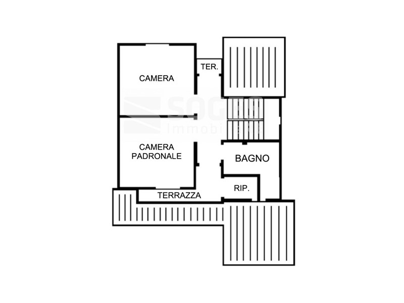 Al primo piano, nella zona notte, ci sono due ampie camere matrimoniali, un servizio finestrato con vasca idromassaggio, e due terrazze.