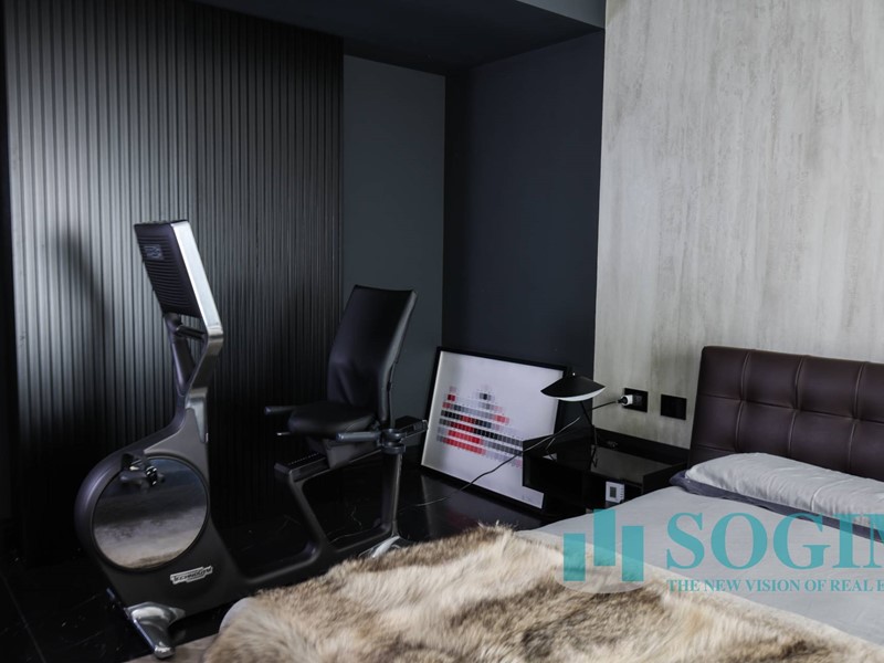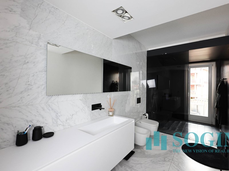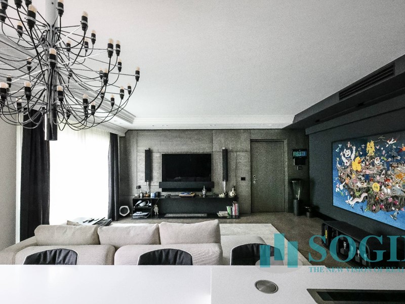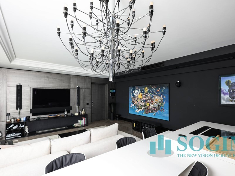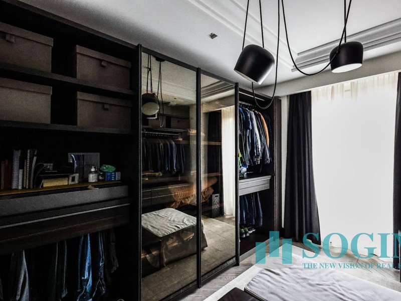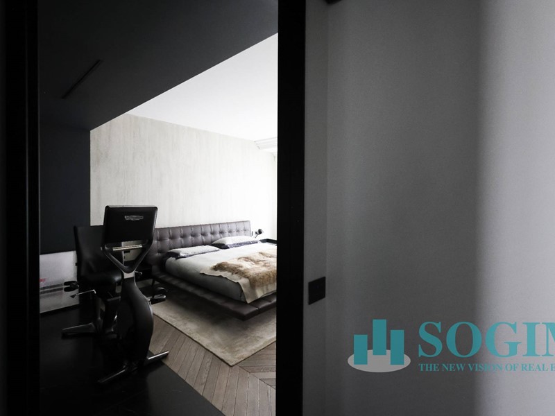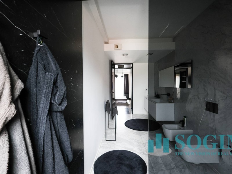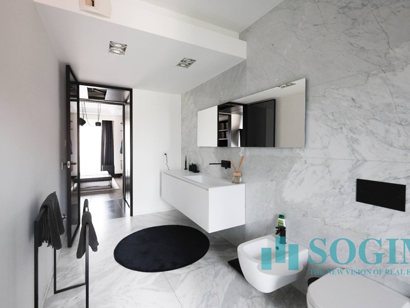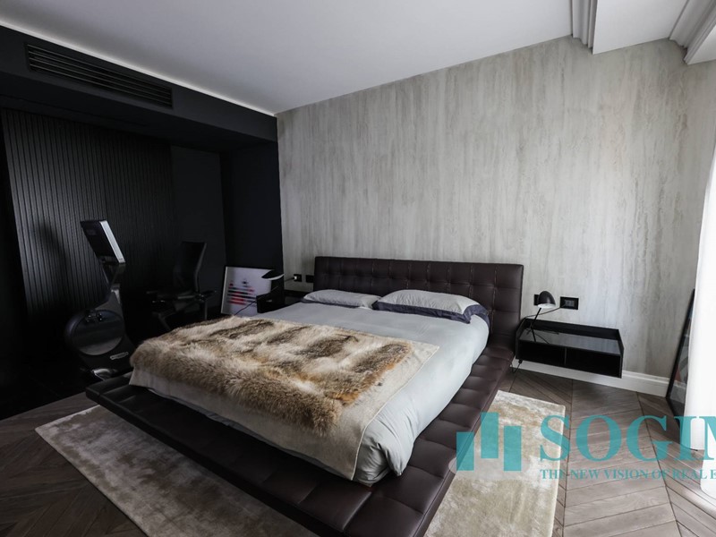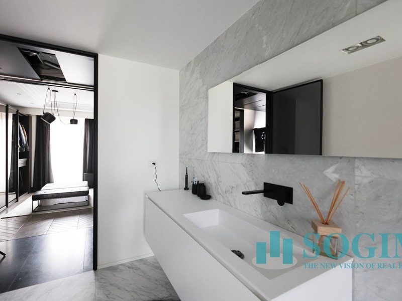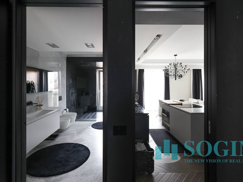 La soluzione è interamente illuminata da un ricercato impianto con lampadari Flos, camera da letto con arredi di design Poliform come anche la seconda camera attualmente utilizzata come cabina armadio.