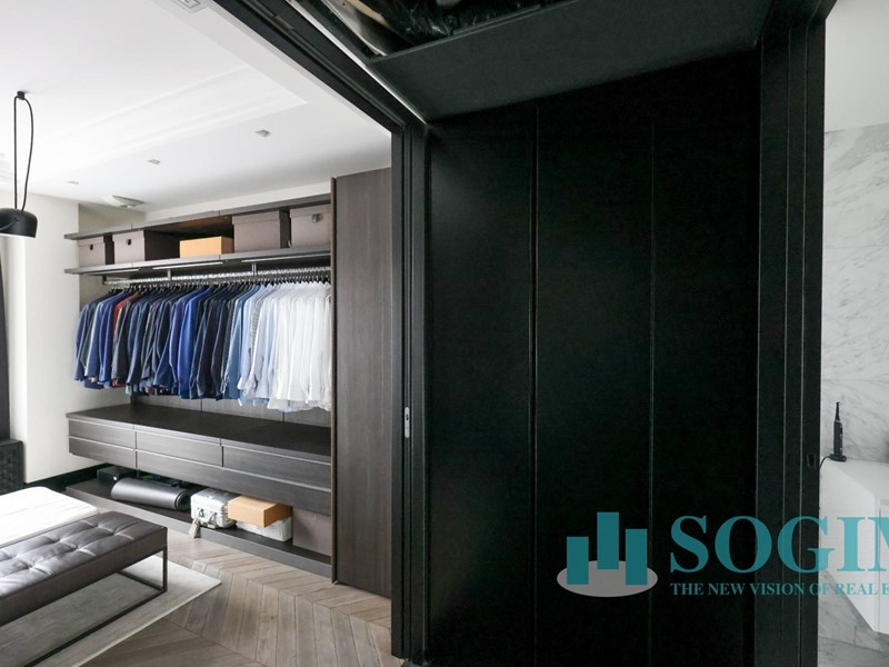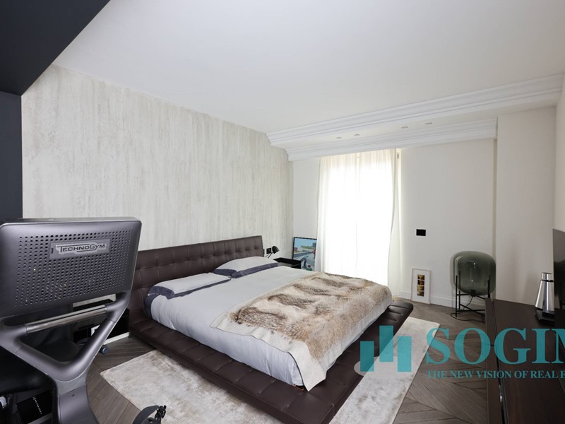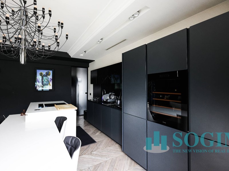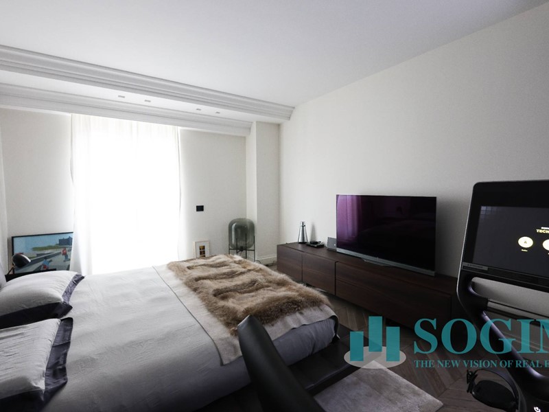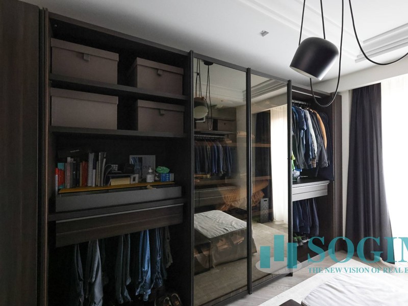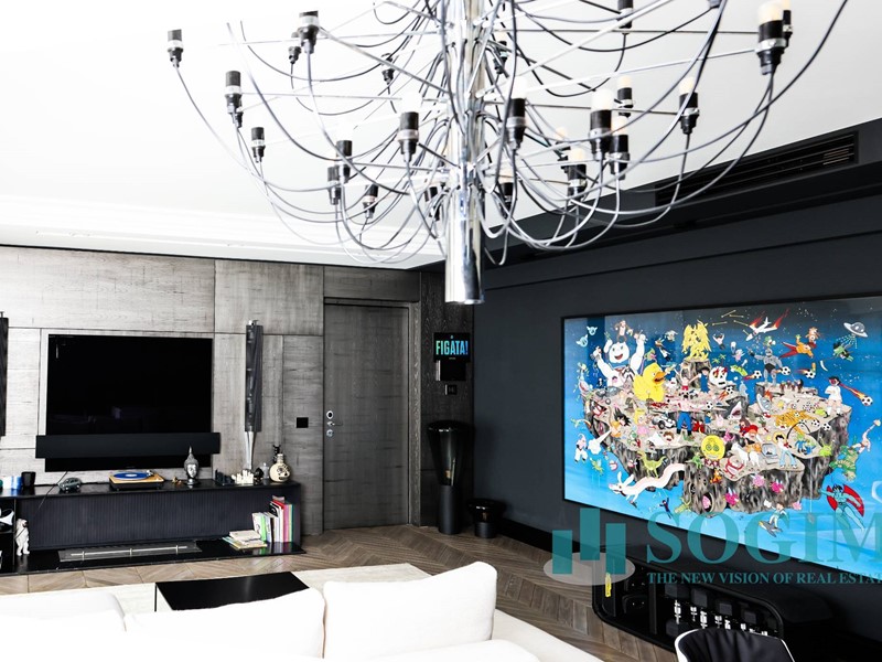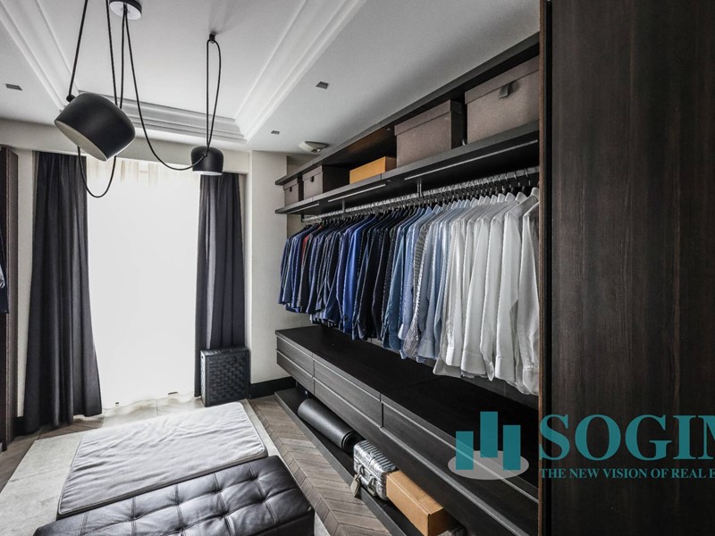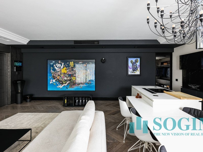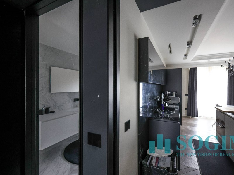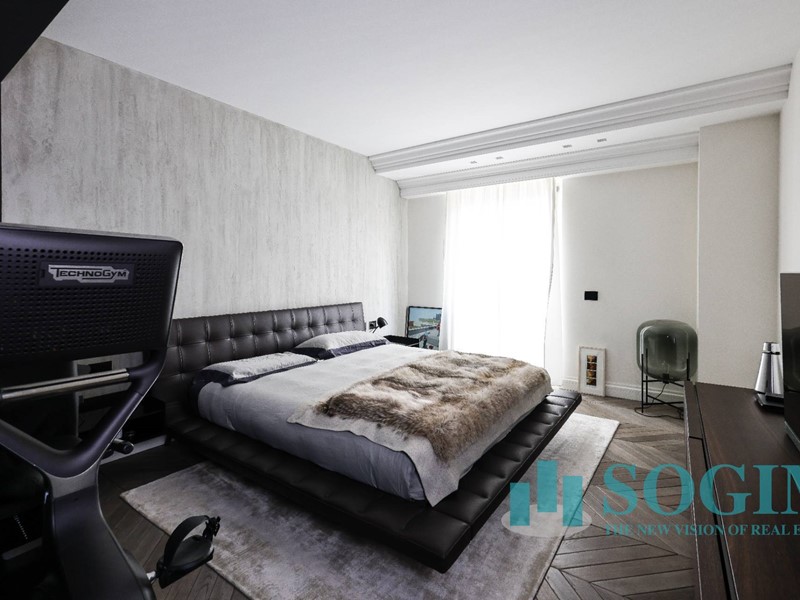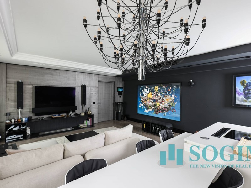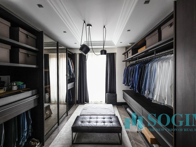 La soluzione è interamente illuminata da un ricercato impianto con lampadari Flos, camera da letto con arredi di design Poliform come anche la seconda camera attualmente utilizzata come cabina armadio.