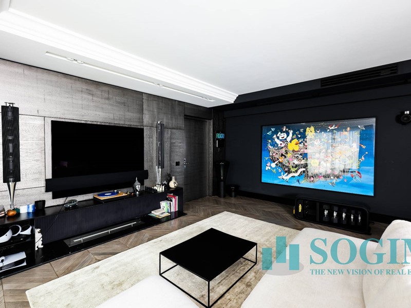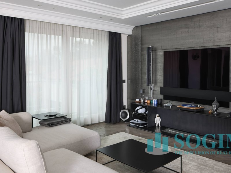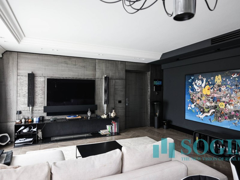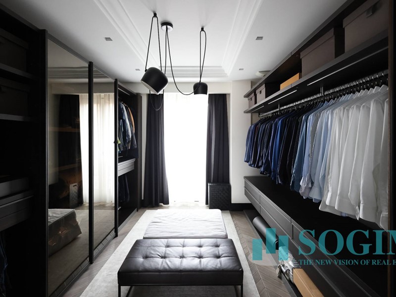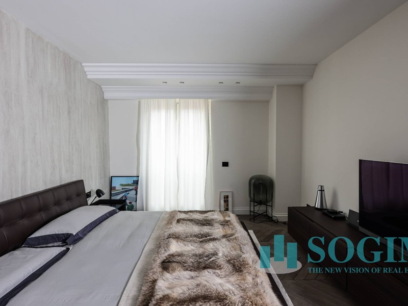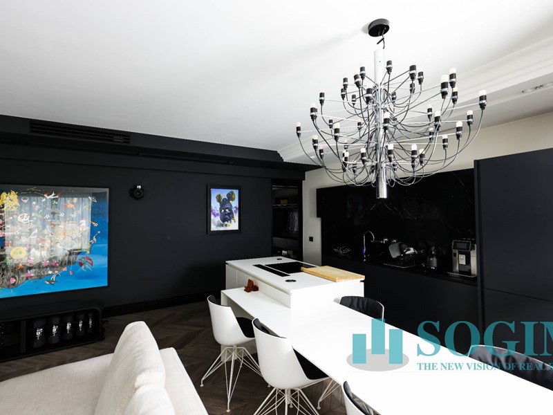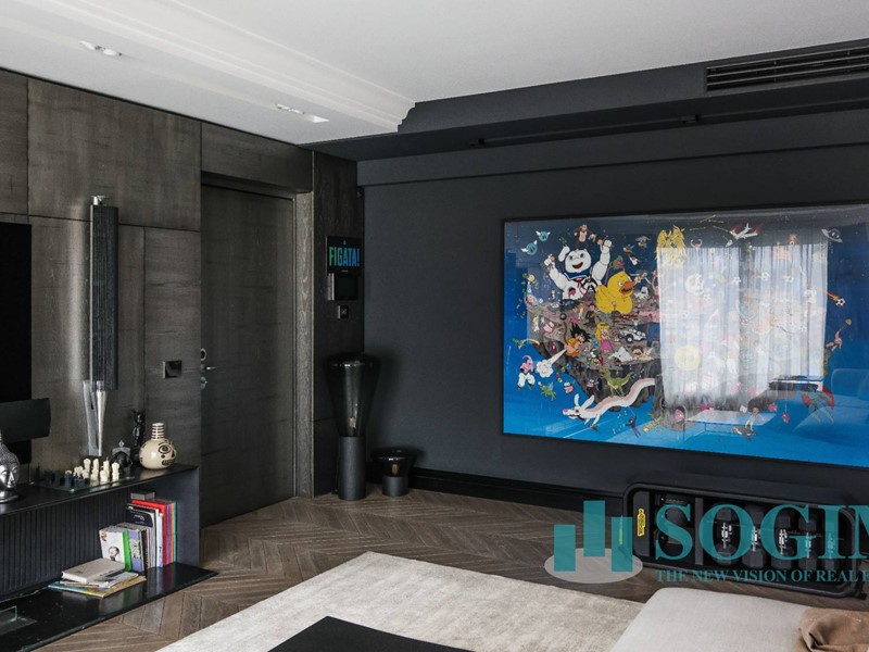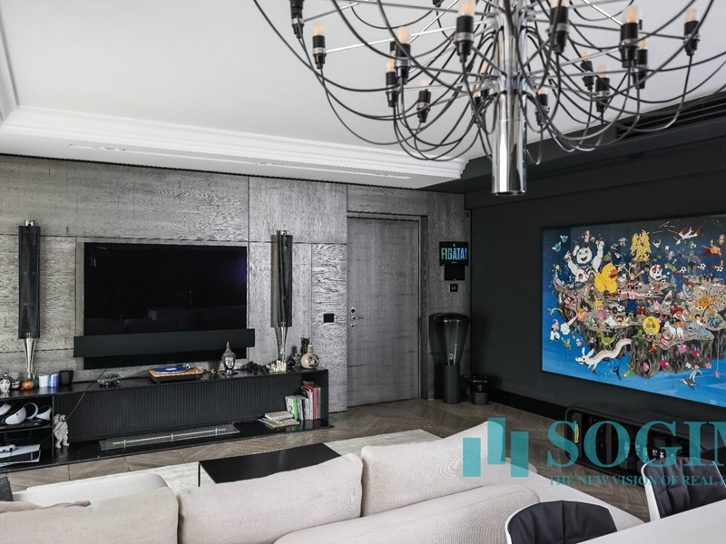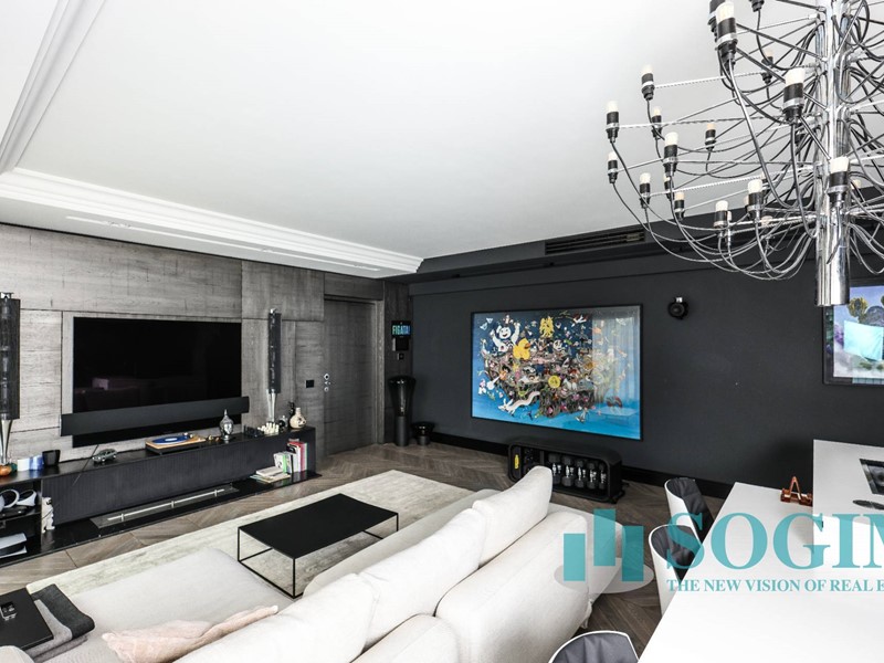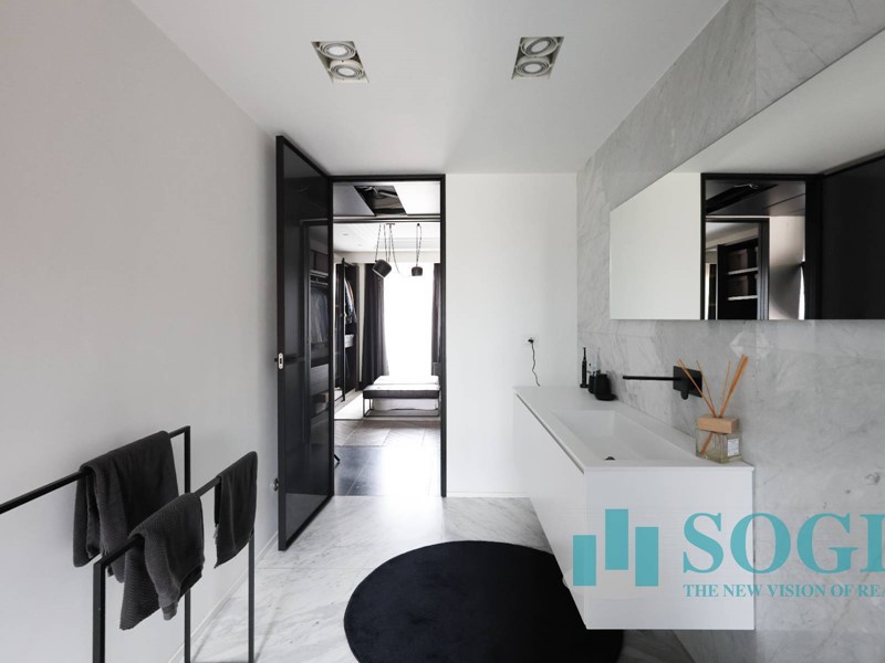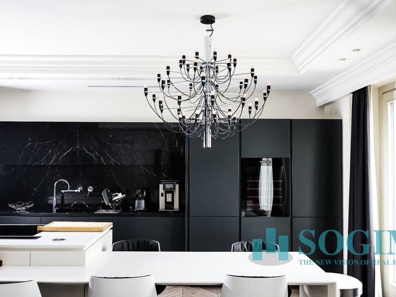 La soluzione è interamente illuminata da un ricercato impianto con lampadari Flos, camera da letto con arredi di design Poliform come anche la seconda camera attualmente utilizzata come cabina armadio.