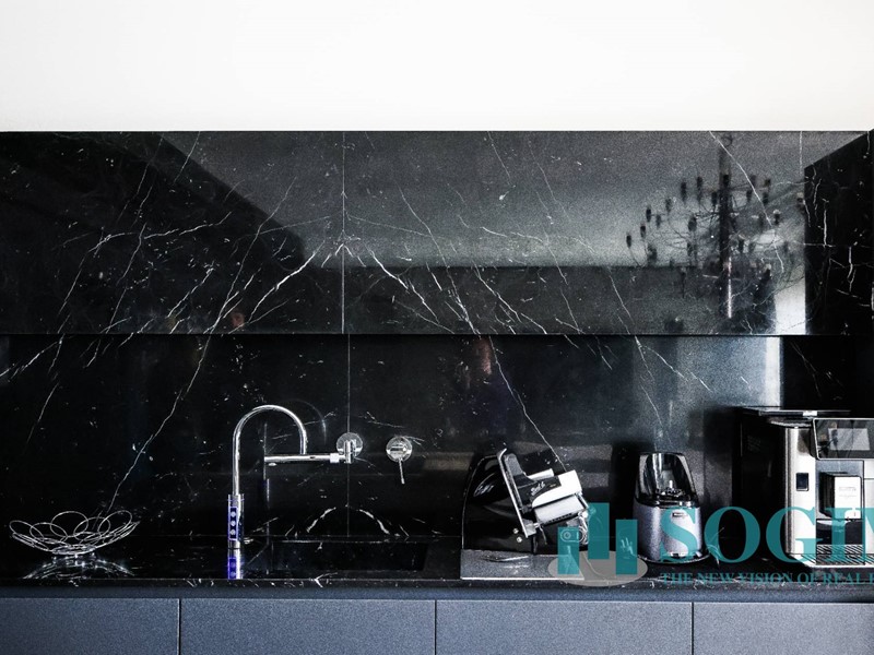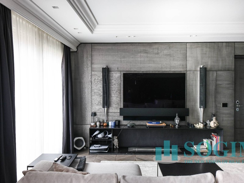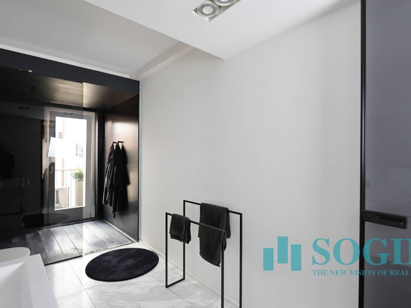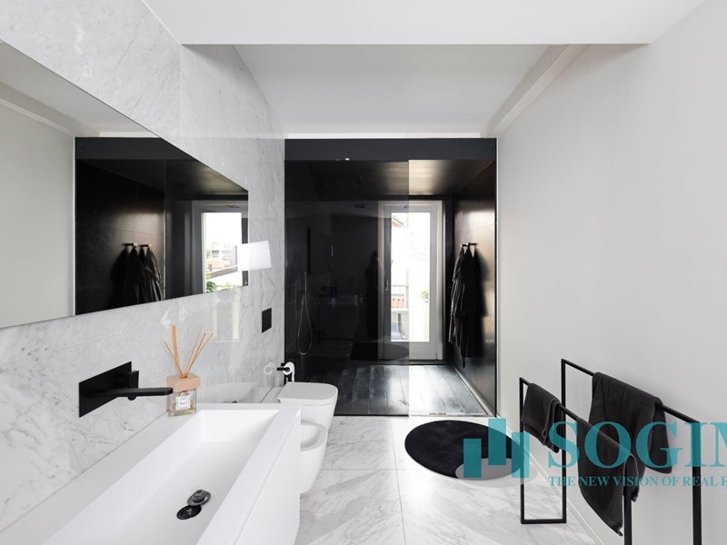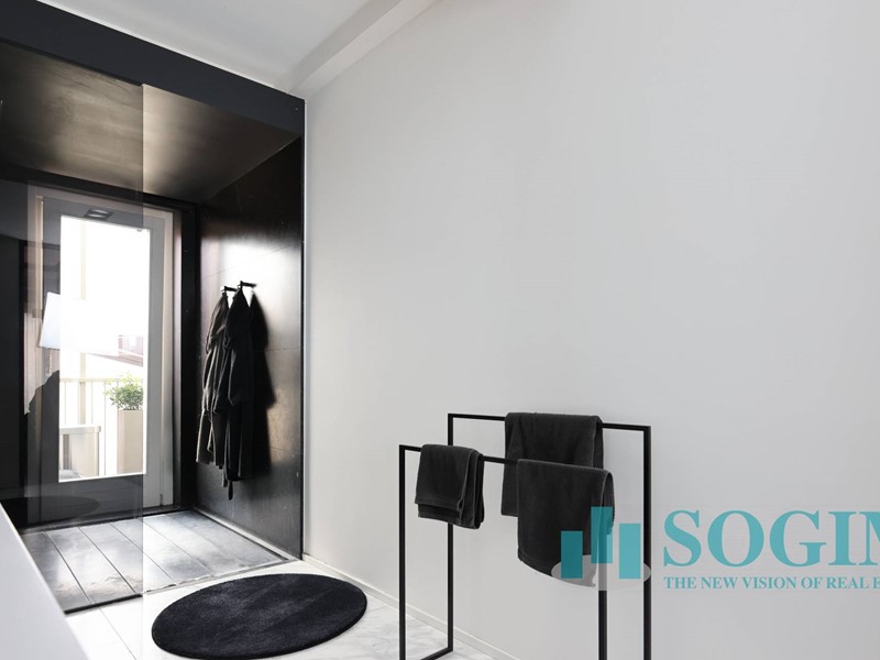 Parlando dei rivestimenti, l'appartamento è stato completato con esclusive finiture come parquet a lisca di pesce e marmo di Carrara bianco e nero nei bagni, dove troviamo spazioso piatto doccia e sanitari sospesi Antonio Lupi.