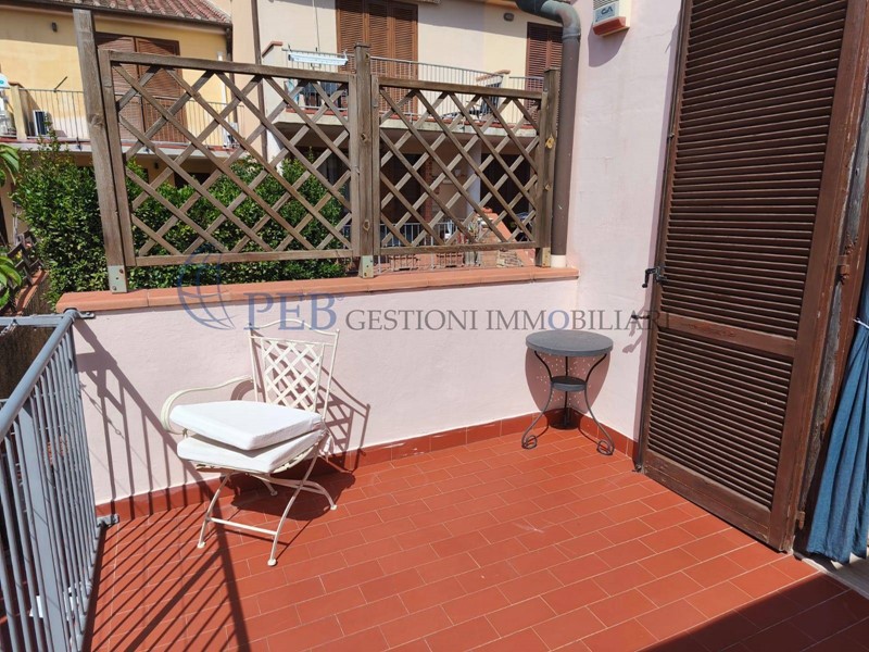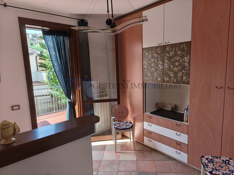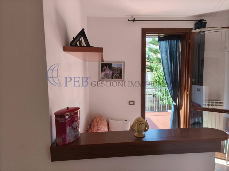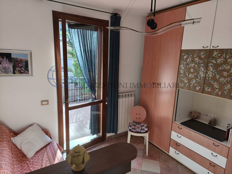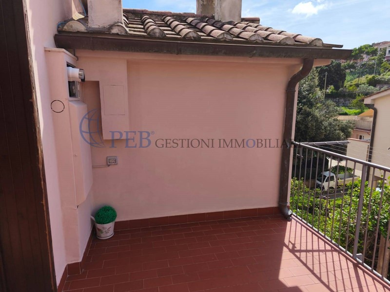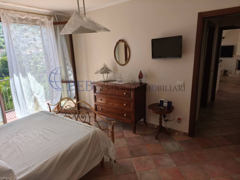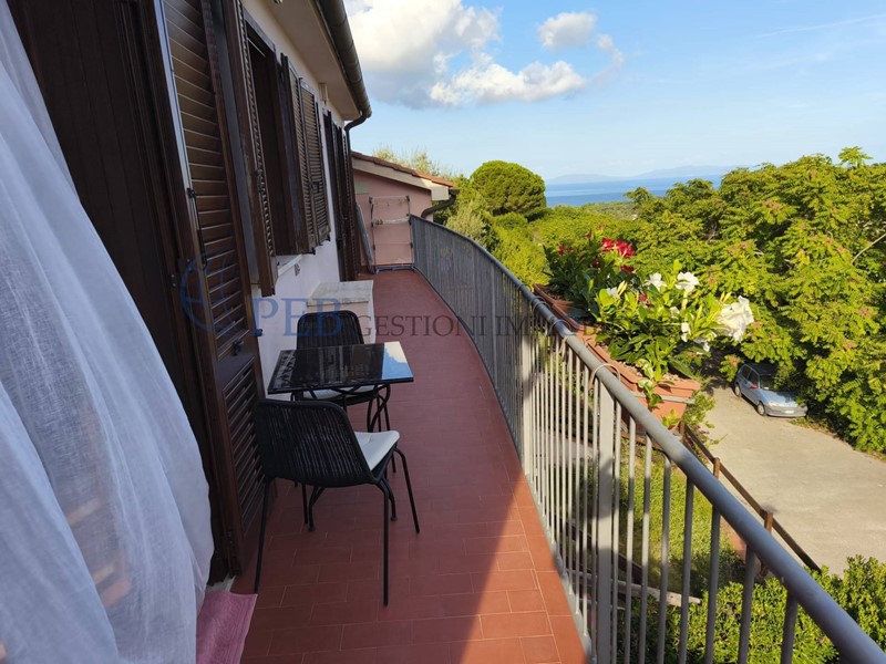 Sia dal soggiorno che dalla camera si accede a un lungo balcone panoramico, perfetto per godere della vista mare e del verde circostante.