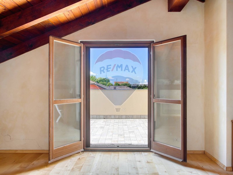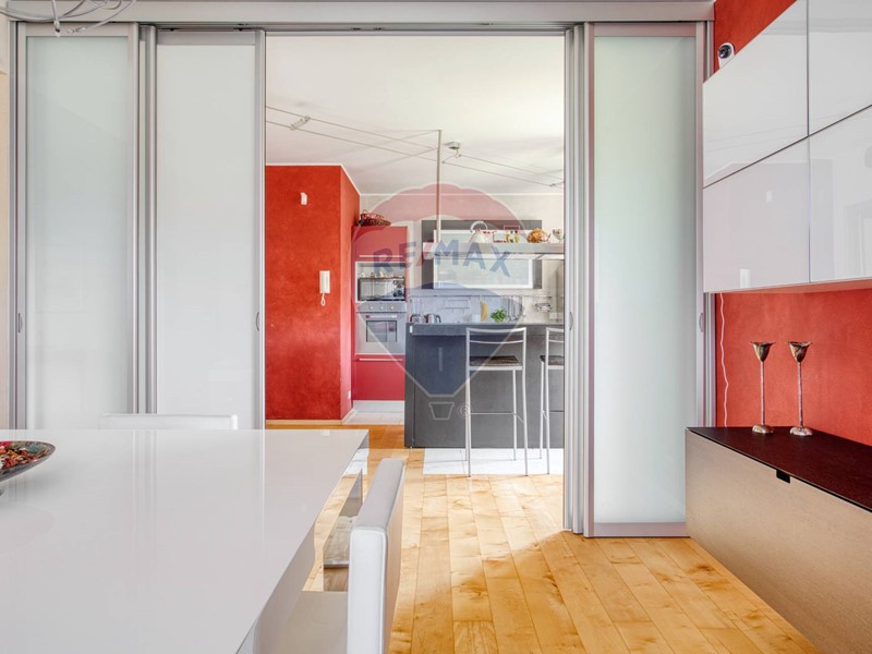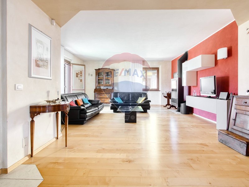 Al piano rialzato, l'ingresso apre sulla zona giorno luminosa e accogliente, composta da un ampio salone con una scenografica stufa a pellet, zona pranzo e una moderna cucina allamericana.