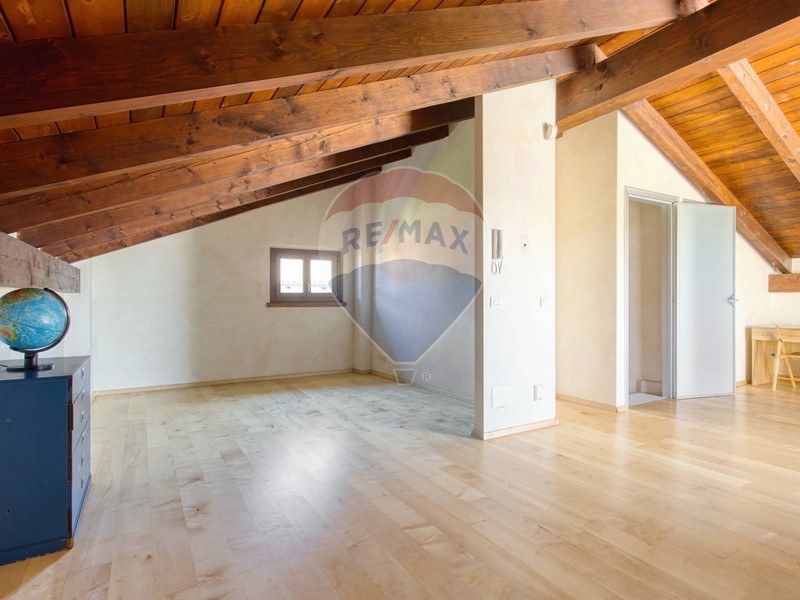 Il piano primo, caratterizzato da suggestive travi a vista, ospita un grande open space ideale come studio, sala hobby o ulteriore zona living, un terzo bagno e un terrazzo riservato e panoramico.