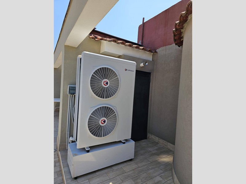 Impianto ibrido con pompa di calore e fancoil per aria fredda e calda distribuiti per tutta la casa..