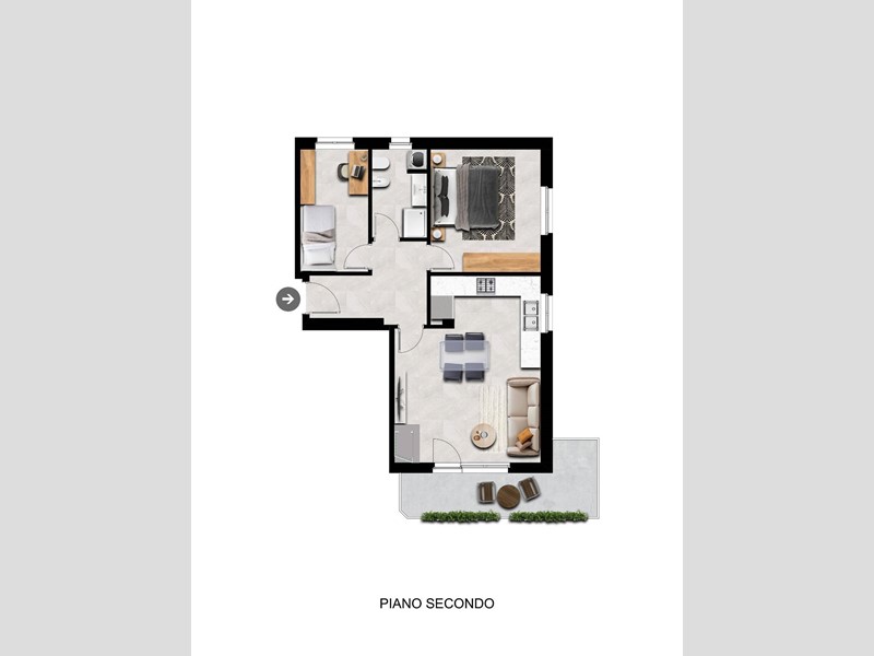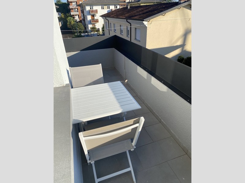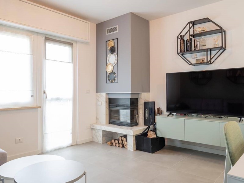 L'appartamento è così sviluppato; dalla porta blindata accediamo nell'ingresso che affaccia sulla zona giorno open-space con angolo cottura (arredato con una cucina di qualità e che viene lasciata nell'appartamento), sulla sinistra e soggiorno con il caminetto a destra, con affaccio sulla terrazza a sud di buone dimensioni; tornando all'ingresso a sinistra abbiamo la zona notte con la camera matrimoniale ampia, il bagno con doccia finestrato e la camera/studio singola.