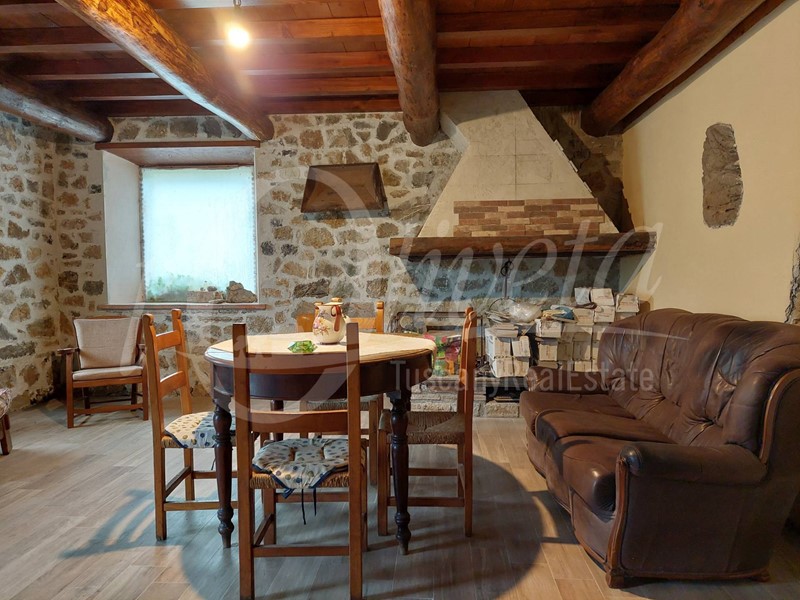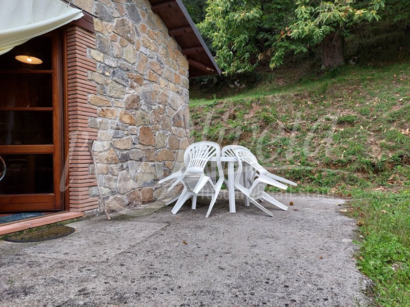 Al piano terra troviamo un ingresso in zona giorno aperta con angolo cottura/pranzo/soggiorno, due camere, disimpegno e bagno. Il termocamino garantisce il riscaldamento e l'acqua calda sanitaria al piano. I pavimenti di questo piano sono in cotto, il soffitto è in travi e tavolato come da tradizione e le finestre sono in legno di castagno con vetrocamera anti sfondamento. Al piano seminterrato, con altezza mt. 2.70, troviamo un bel locale ad uso taverna con pavimento in gres porcellanato effetto parquet e muri in pietra, un bagno ed un grande vano ad uso cantina, destinato in parte a locale tecnico e in parte a zona pranzo. Questa ultima stanza è da rifinire, con i materiali già disponibili in loco. Al piano seminterrato non è presente l'impianto di riscaldamento ad eccezione del bagno e della taverna, riscaldata con un camino tradizionale e sono presenti gli infissi esterni (porte) ad eccezione delle finestre. L'immobile si presenta in condizioni di manutenzione molto buone, funzionale e dotato di tutti i comfort per essere abitato stabilmente. Possibilità di acquistare altre particelle di terreno contigue fino ad una superficie di circa 8.000 mq.