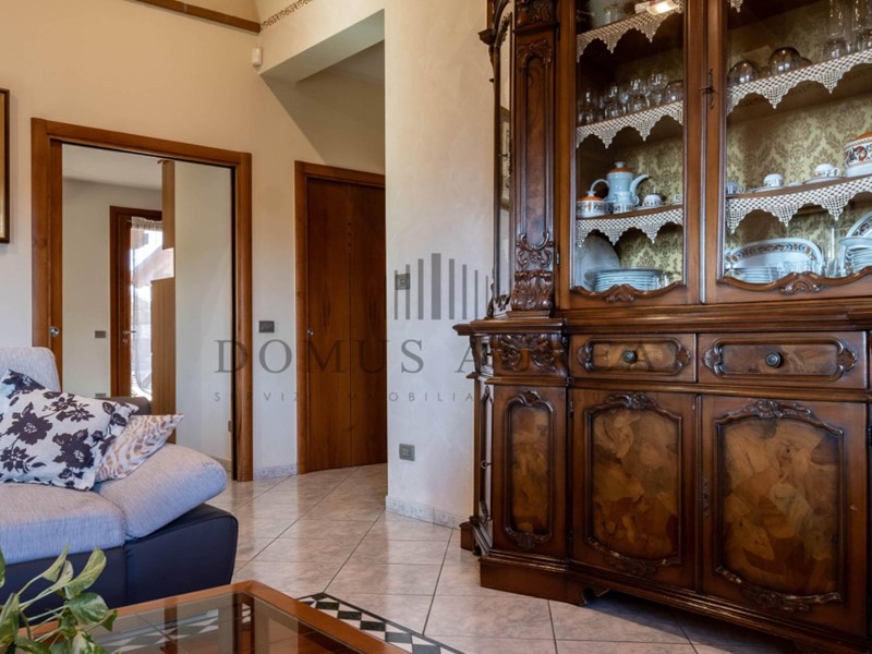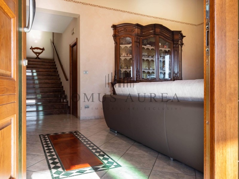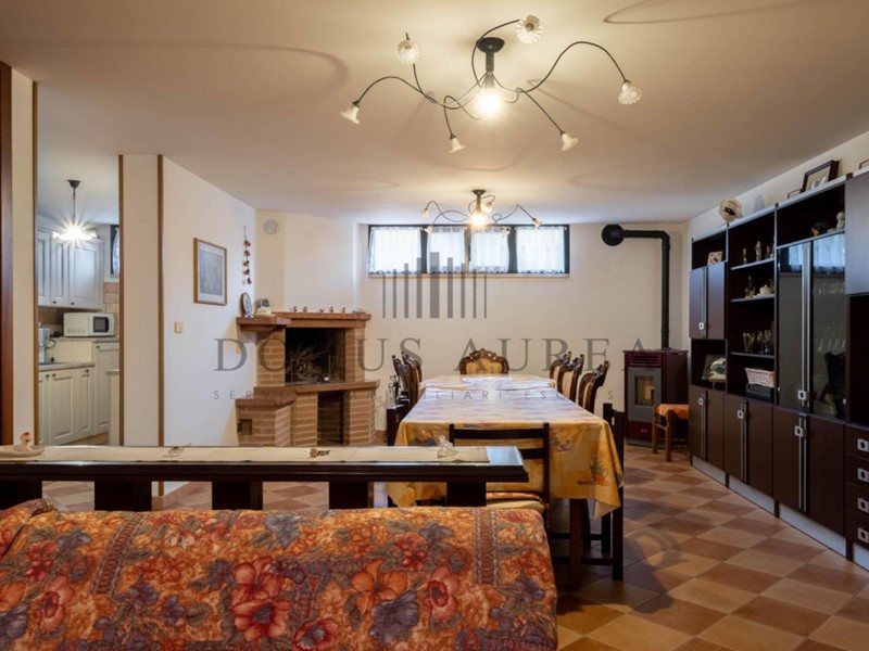 Immagina di varcare la soglia di casa sotto un ampio portico con travi a vista, che racconta subito il calore e lautenticità di questa splendida villa. Lingresso si apre su un soggiorno luminoso e arioso, dove le grandi finestre regalano una vista incantevole sul giardino, inondando gli ambienti di luce naturale e rendendoli subito accoglienti.