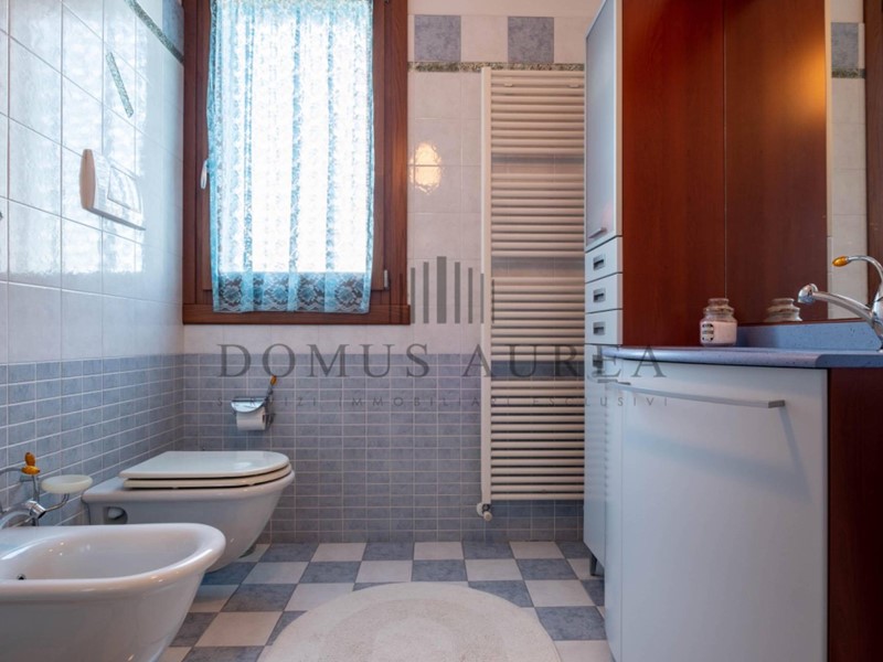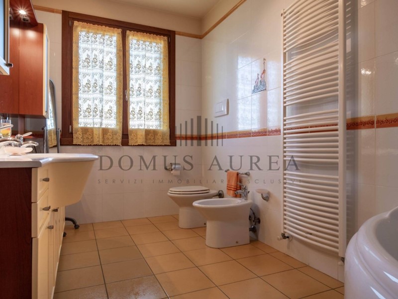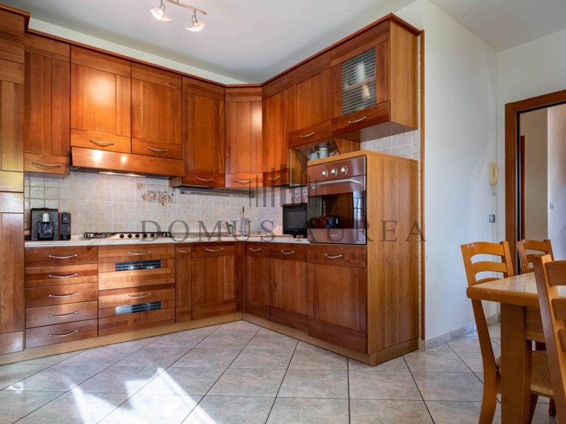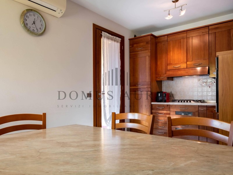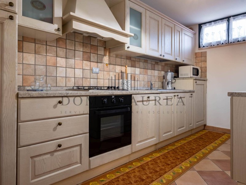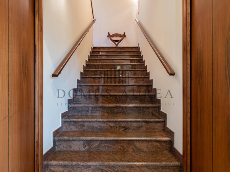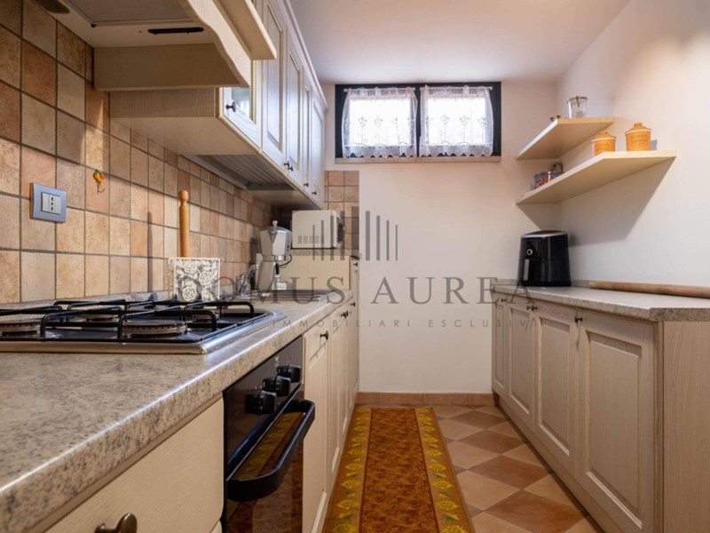 La cucina, elegante e funzionale, è separata da una porta vetrata decorata con disegni a piombo: una soluzione raffinata che unisce privacy e luminosità. Al piano terra trovi anche uno studio riservato, perfetto per chi lavora da casa o desidera uno spazio dedicato alla lettura, allo studio o alla propria creatività.