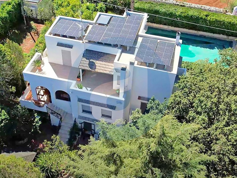 FINITURE: Infissi in alluminio a taglio termico con triplo vetro e zanzariere. Impianto di raffrescamento e riscaldamento ad aria. Impianto fotovoltaico da 16 Kw con batterie da accumulo. Solare termico. Cappotto termico sulle facciate. Impianto di allarme. Tre postazioni di ricarica per auto elettriche. Fossa imhoff a norma. APE A4.
