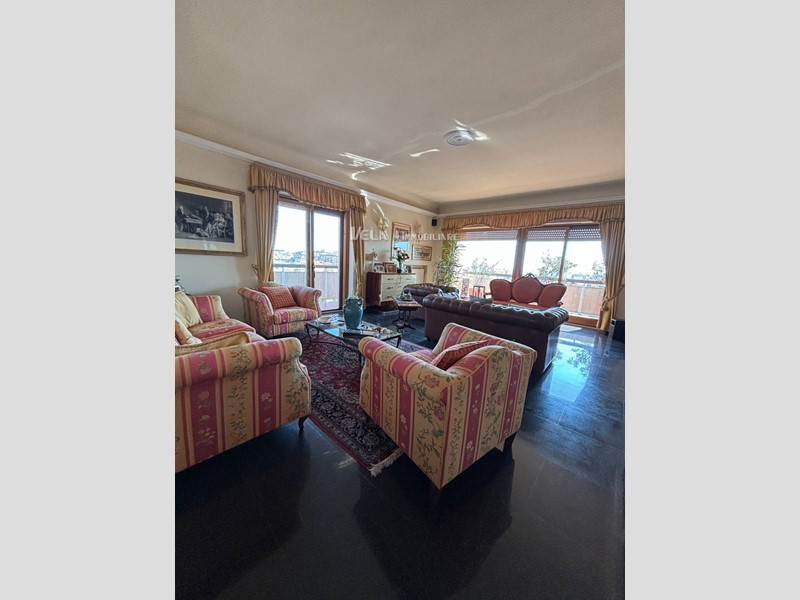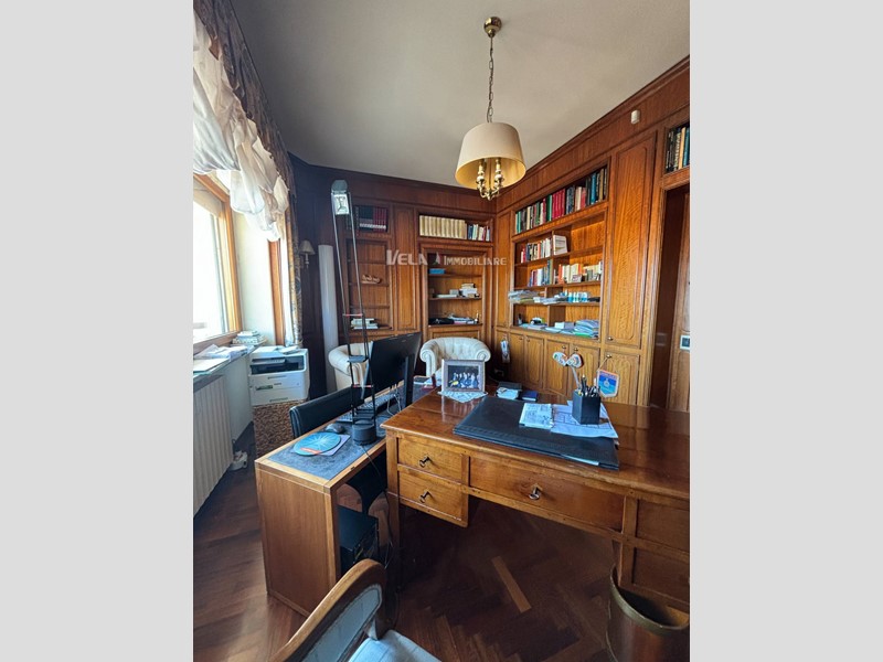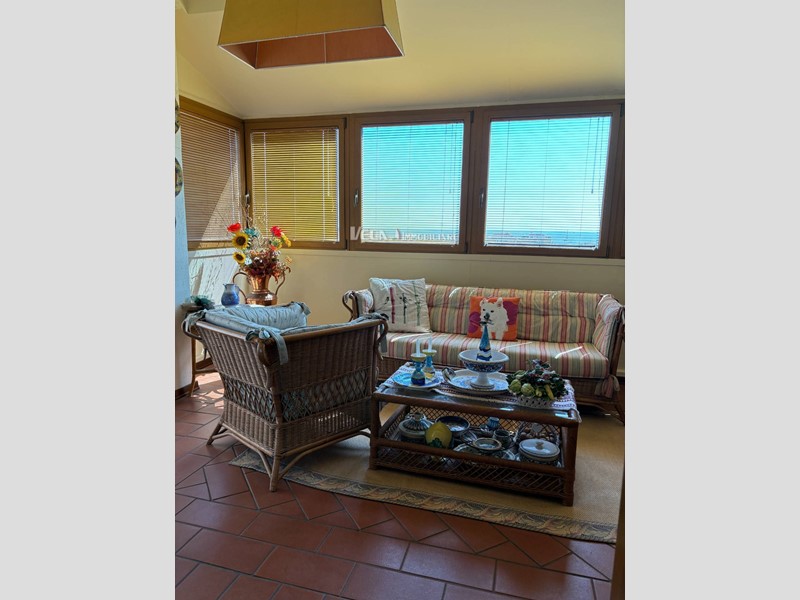Una bella scala interna in legno collega l'appartamento al piano superiore, dove troviamo un'ampia zona soggiorno o sala hobby con camino, parquettes e raffinata boiserie e una camera con bagno annesso. Dal soggiorno, tramite portone blindato, si accede ad un meraviglioso terrazzo di oltre 200 metri, con doccia esterna e lavatoio.
