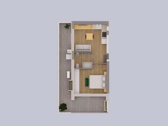 La tipologia di appartamento sopra descritto è disponibile anche al piano terra con due unità diverse, una di 49 mq con due camere un bagno e una corte privata di 40 mq, l' altra soluzione è un appartamento di 63mq con due camere due bagni e una corte privata di 27 mq.
