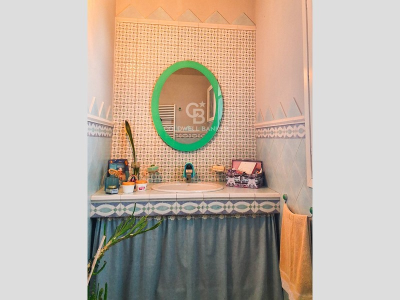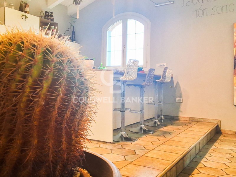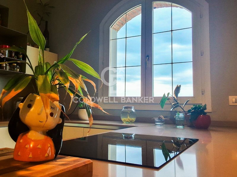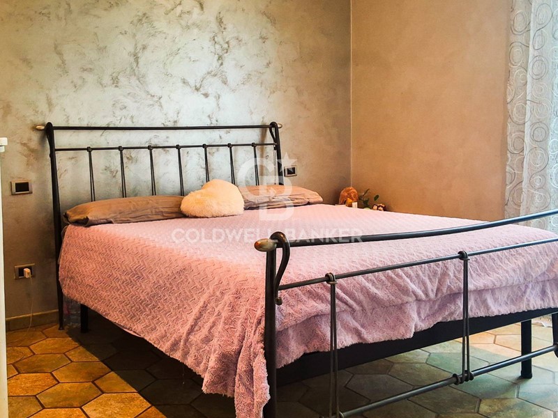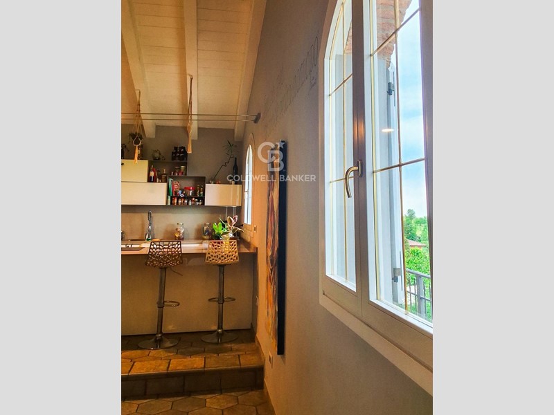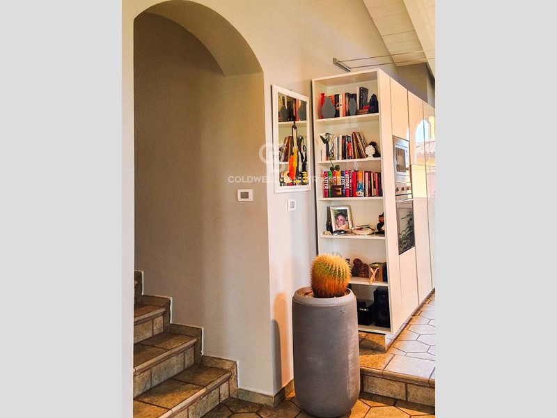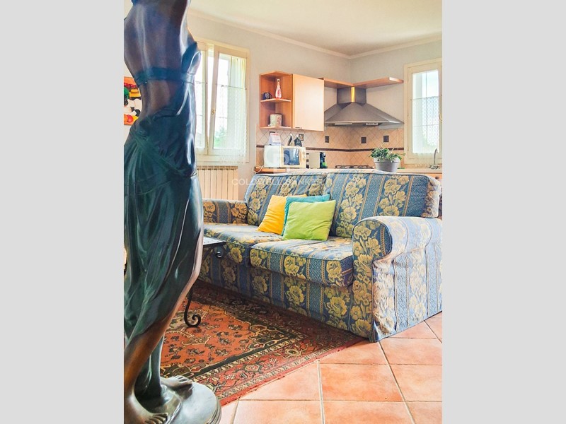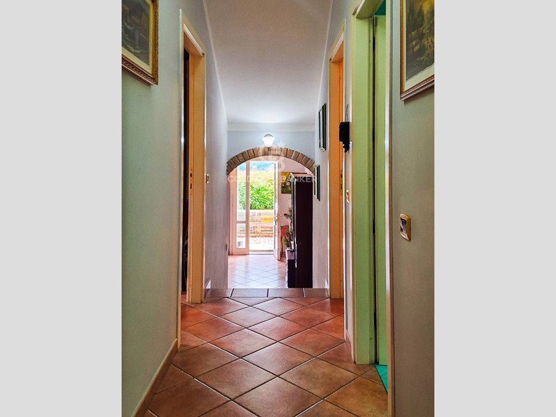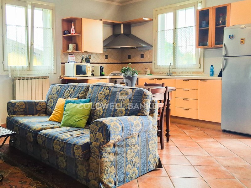 Con una scala interna in legno si raggiunge il livello sottostante, con ingresso indipendente e composto da un soggiorno con angolo cottura e camino, una camera matrimoniale, un bagno cieco, una seconda camera con cabina armadio ed un ripostiglio. Garage doppio con doppia basculante automatica.