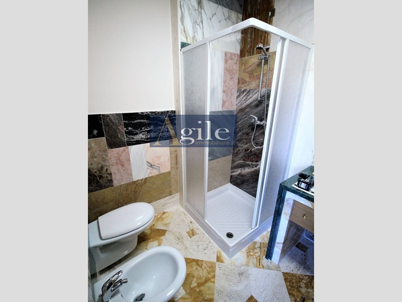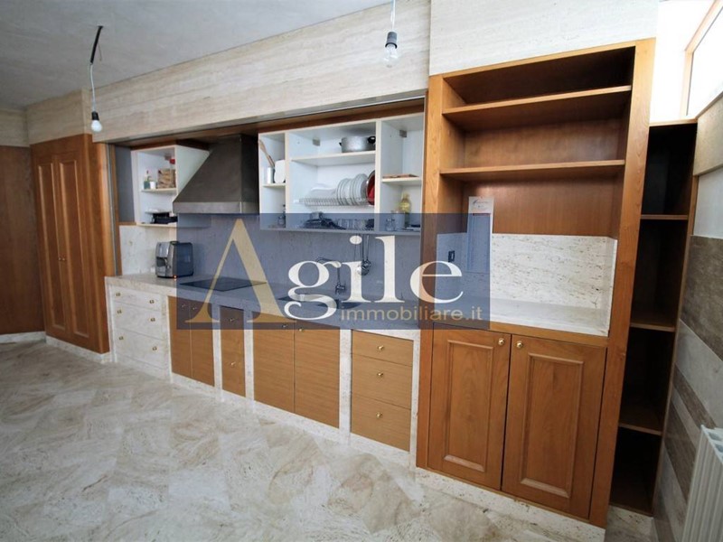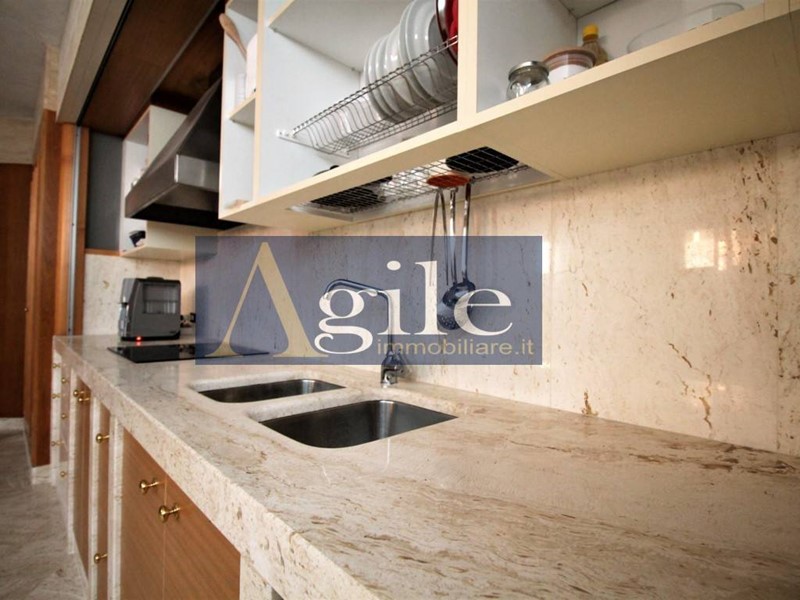 Pavimentazione in Travertino Resinato e giallo silene posizionato sull'intera superfice dell'appartamento, primo bagno nella zona giorno in Travertino Resinato completo di mobile bagno in marmo attrezzato con contenitori in legno di castagno, secondo bagno al servizio di una delle due camere matrimoniali in marmo policromo completo di mobile bagno con contenitori in legno di castagno, porte in legno di castagno massello, cucina su misura in travertino resinato completa di dispensa in legno di castagno, piano di cottura a induzione e soluzione a scomparsa con chiusura automatizzata, contenitori porta abiti in legno di castagno, installazione di pompa di calore per il riscaldamento con posizionamento all'esterno, videocitofono, predisposizione allarme, illuminazione interna interamente a Led;
