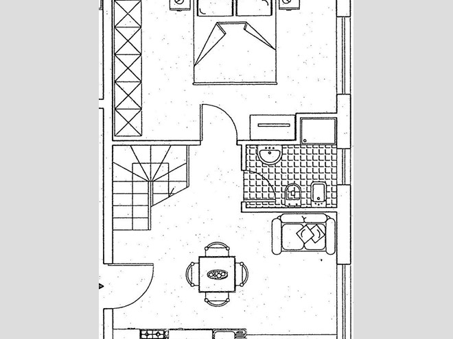 -Primo livello: ingresso su soggiorno con angolo cottura, bagno con box doccia, camera da letto matrimoniale, scala di collegamento al piano superiore;
