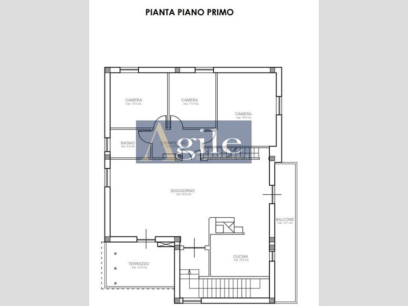 Piano Primo composto da tre camere da letto matrimoniali, bagno con finestra, soggiorno con terrazzo, cucina abitabile, portone di ingresso per andare diretti al piano terra nel secondo ingresso.
