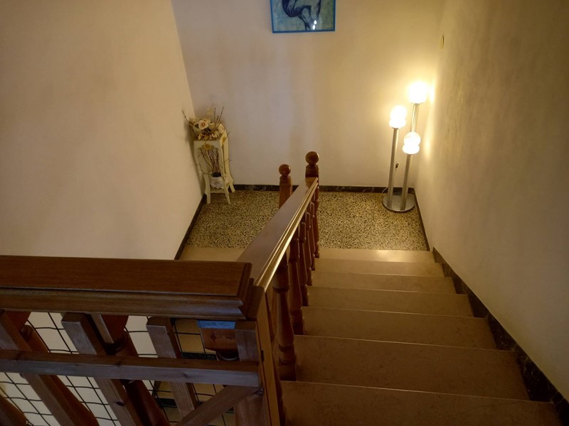 Al primo piano abbiamo una ampio soggiorno con terrazza, cucinotto e tre camere - di cui due matrimoniali e una singola- bagno con finestra e vasca.