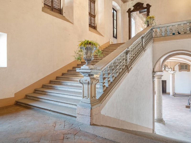 Piano superiore: collegato al piano inferiore da una monumentale scala in granito rosa, questo piano accoglie ampi saloni con soffitti a cassettoni, decorati da affreschi di scuola Tiepolesca e arredi del Seicento.