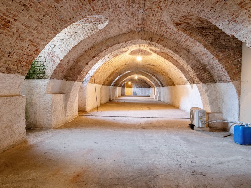 Cantina storica: una sala discoteca è stata ricavata nellantica cantina a volta, con pareti in mattoni a vista, uno spazio versatile e affascinante che aggiunge un tocco di modernità alla proprietà.