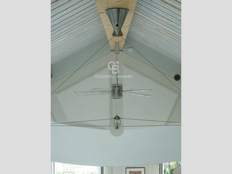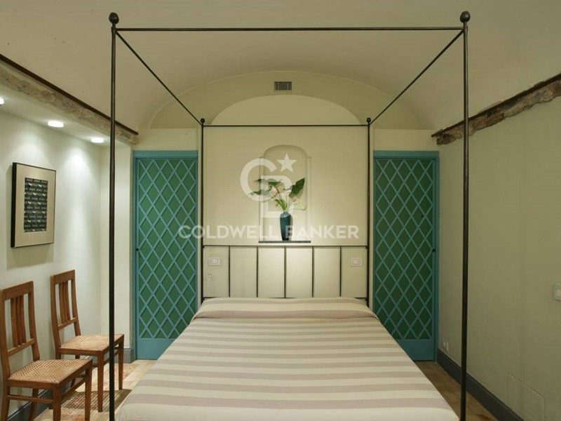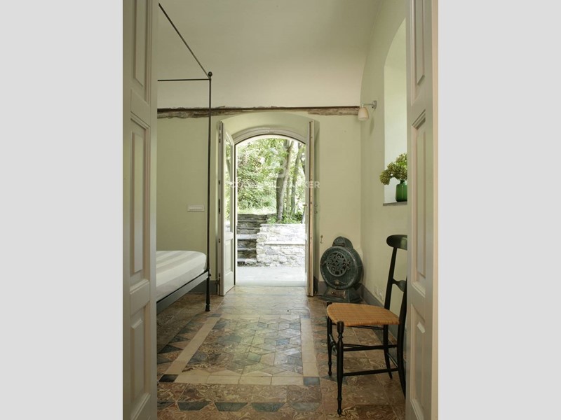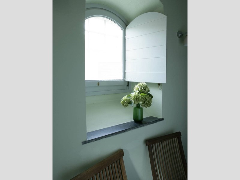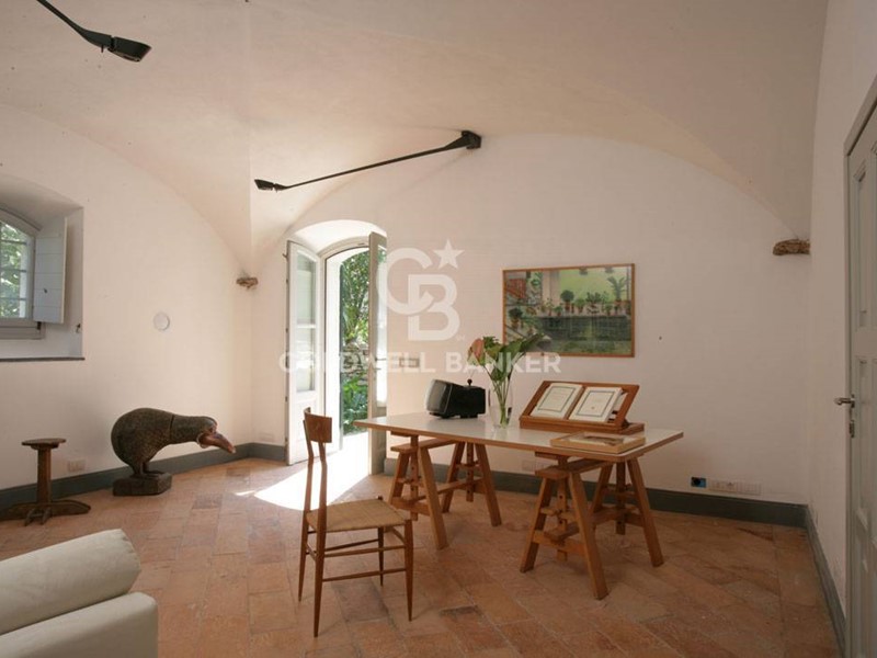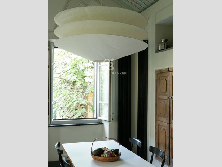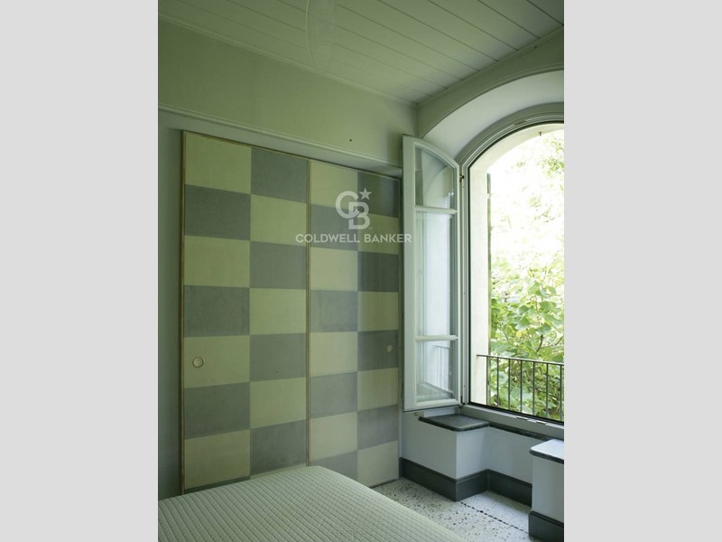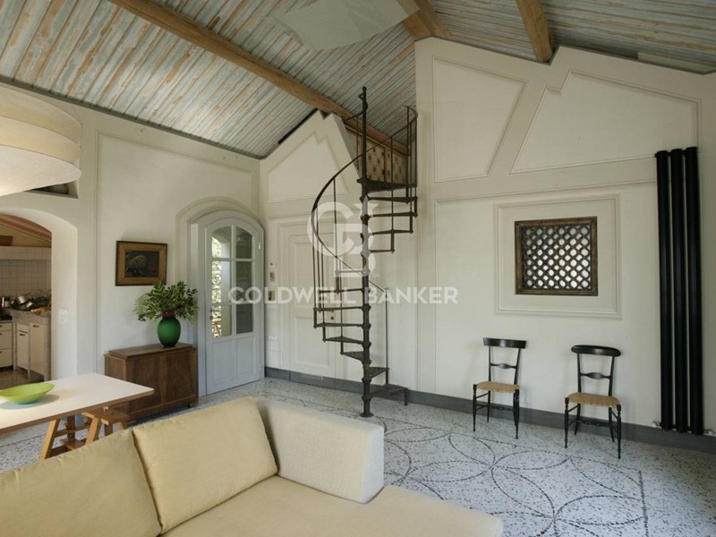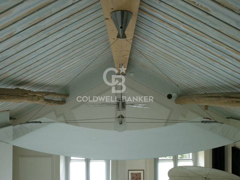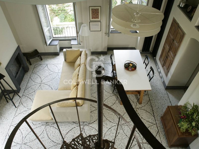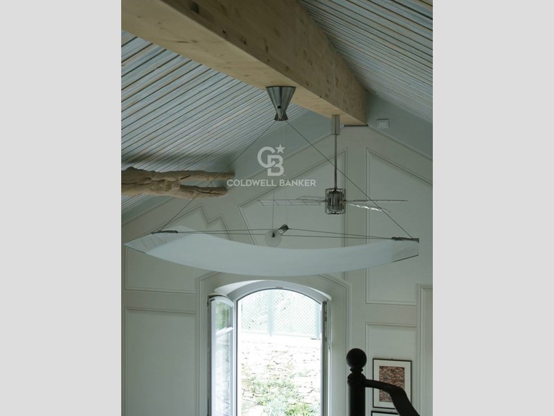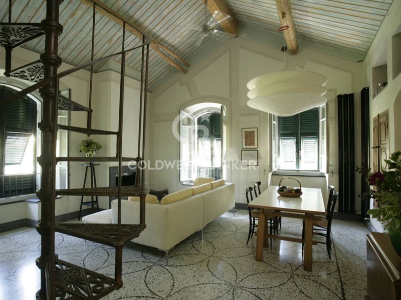 Soggiorno: soffitto-tetto autoportante decorato, travi a vista, camino e ampie finestre alla genovese con doppi vetri antisfondamento; decorazioni trompe-l'oeil in stile architettonico; pavimento in seminato veneziano realizzato su disegno originale dai fornitori del Palazzo Ducale di Genova.