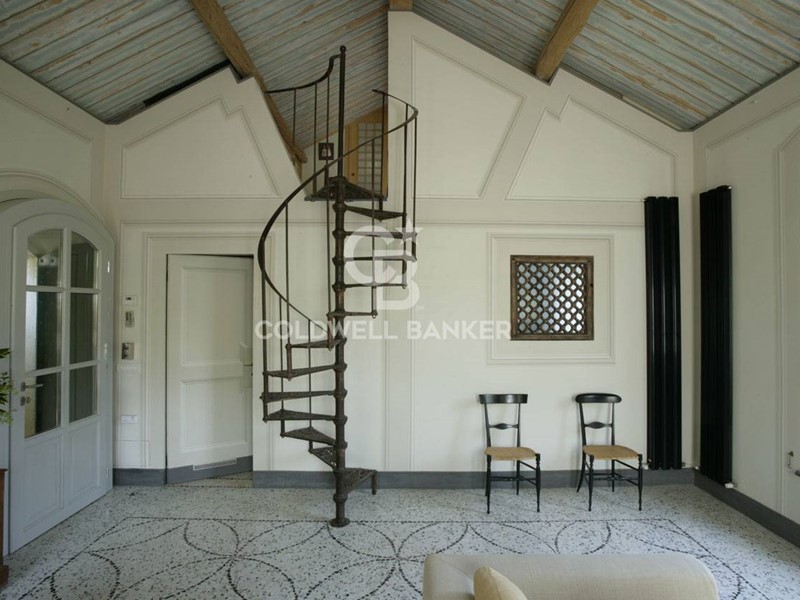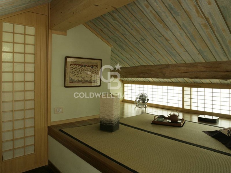 Soppalco: stanza con tatami in stile giapponese, bagno e ampio armadio ripostiglio; collegato al soggiorno tramite una scala a chiocciola in ghisa in stile Novecento. Pavimento in listoni di legno.