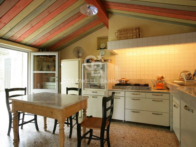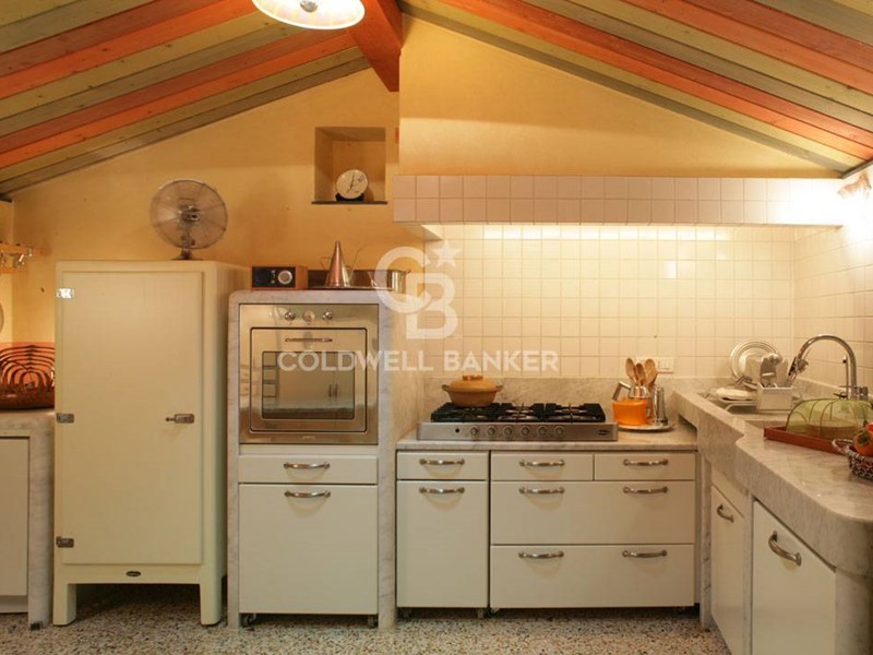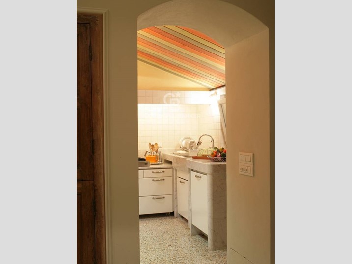 Cucina: realizzata in marmo bianco massello, dotata di elettrodomestici di classe A e forno Smeg (design Renzo Piano). Pavimento in seminato.