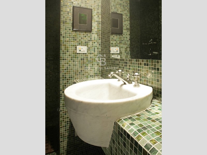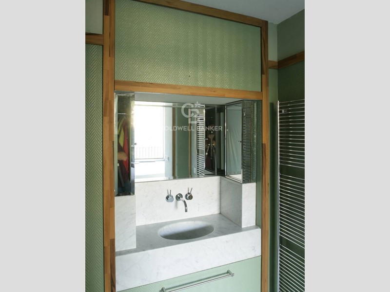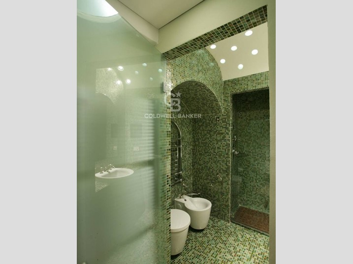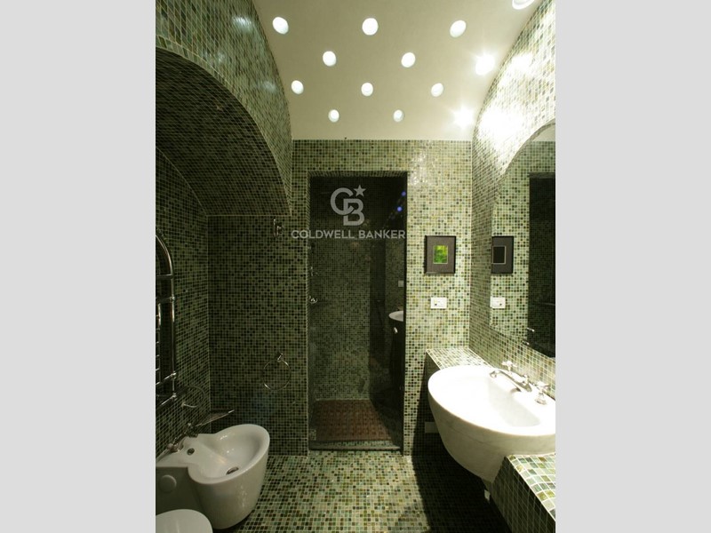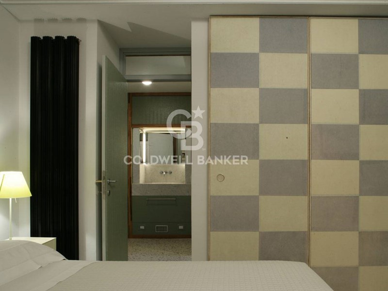 Zona notte: antibagno-spogliatoio con lavabo in marmo massello, bagno con vasca idromassaggio e rubinetteria Vola; pavimento e pareti in ardesia policroma. La camera da letto ha un ampio armadio a muro e lampade Luceplan.
