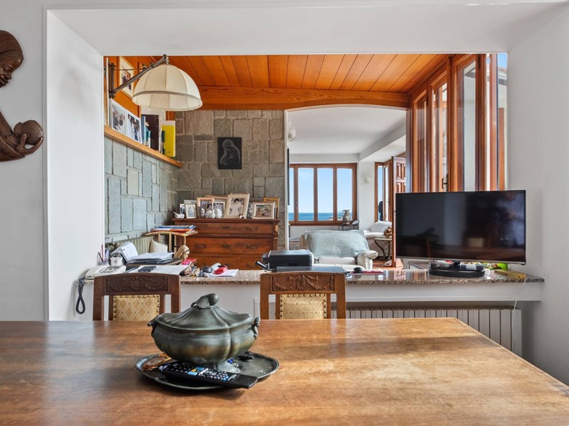 Piano terra: ampio soggiorno con vetrate panoramiche e accesso al terrazzo vista mare, cucina con zona pranzo e uscita sul terrazzo, bagno, antibagno e lavanderia.