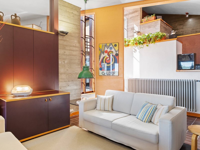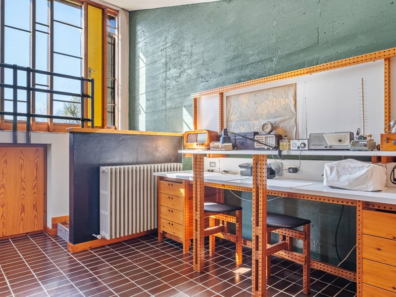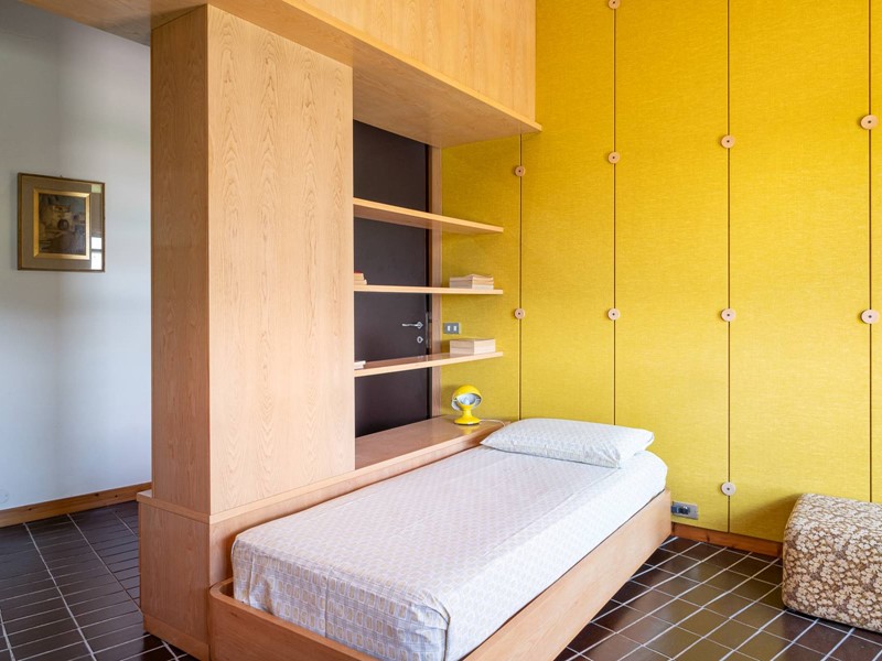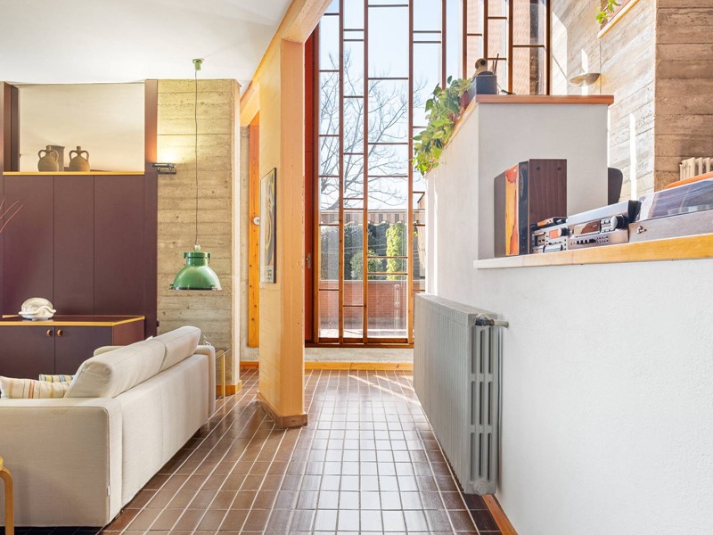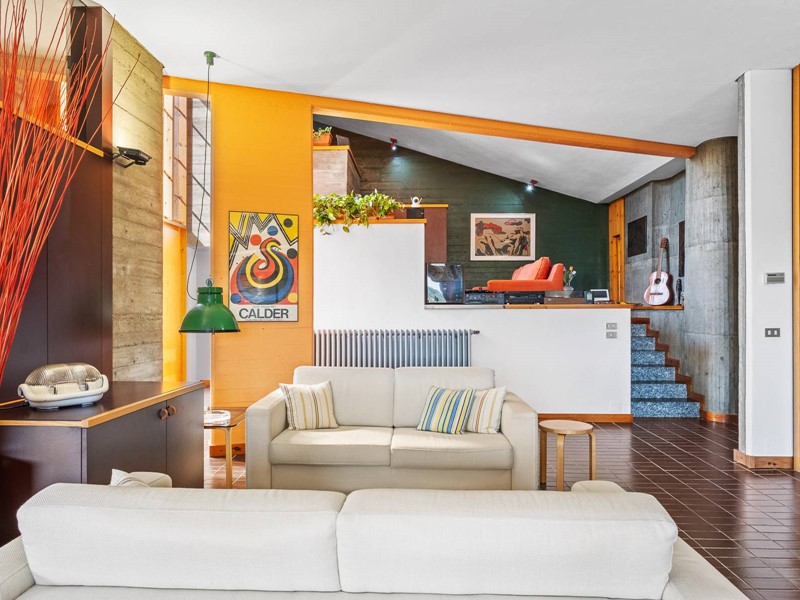 Zona giorno: un ampio soggiorno con vetrate a tutta altezza si apre direttamente sul giardino, incorniciando il panorama collinare. Gli interni sono caratterizzati da altezze generose, cemento a vista e arredi in legno realizzati su misura.