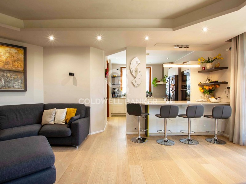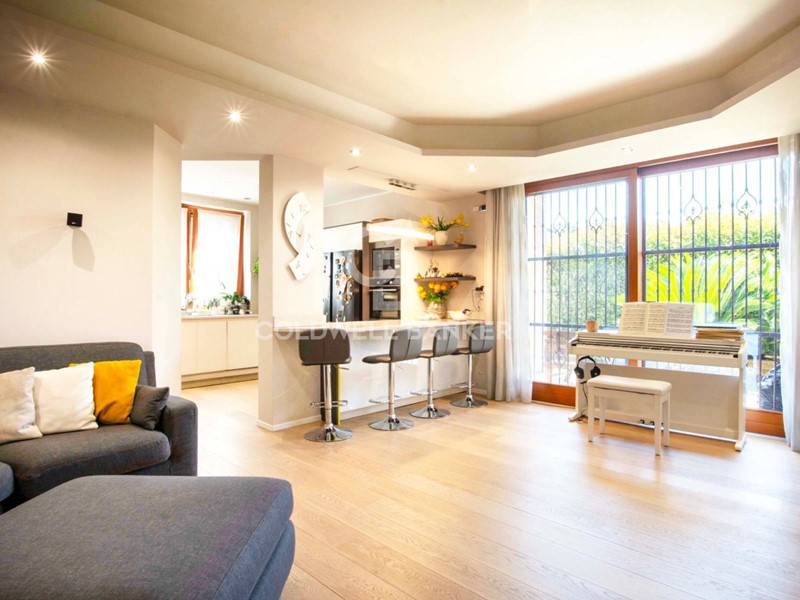 Entrando nell'appartamento si accede allo spazioso living con affaccio sul giardino privato, separata ma a vista sul soggiorno troviamo l'ampia cucina abitabile, sala da pranzo con vista sul giardino e ampio portico coperto con tavolo esterno.
