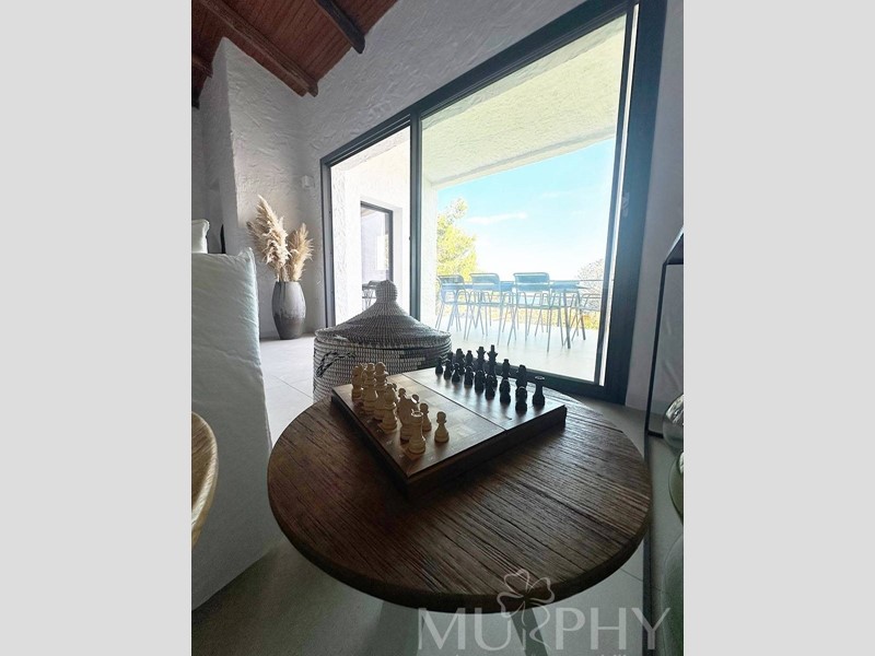 La villa di compone da un ingresso che conduce ad un ampio soggiorno diviso in due ambienti, entrambi dotati di grandi vetrate che offrono una vista mozzafiato sul mare. Dai grandi finestroni si accede direttamente alle terrazze coperte, ideali per pranzare o cenare all'aperto mentre si godono le suggestive sfumature del mare.