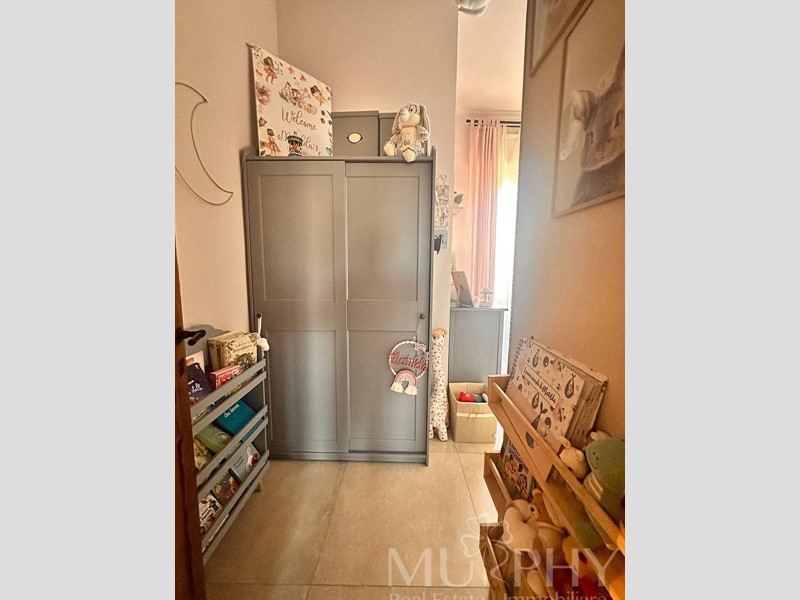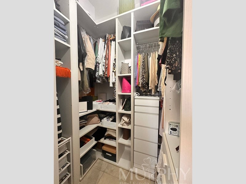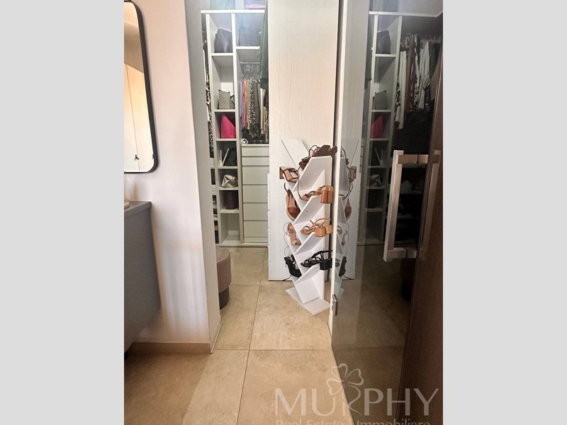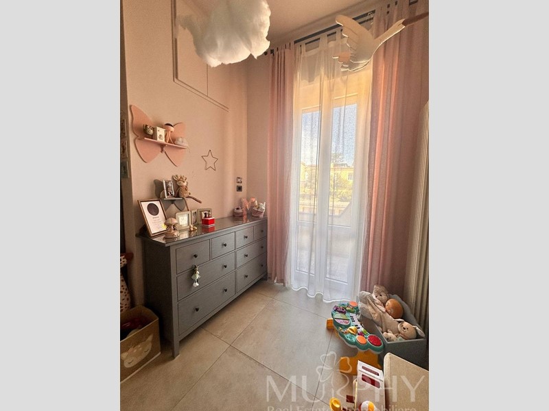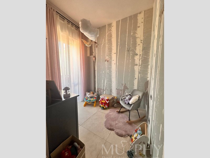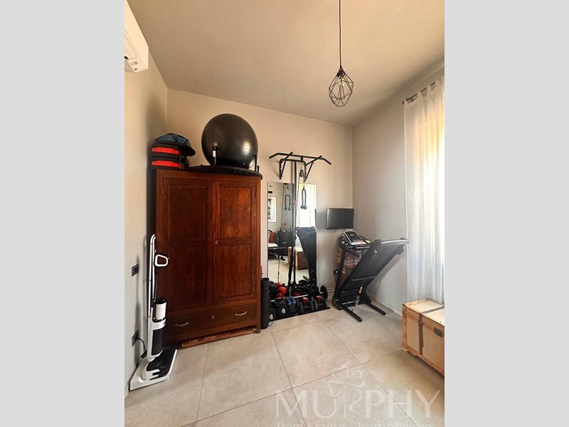 L'immobile ben distribuito è composto da ampio ingresso, soggiorno con cucina a vista e balcone, uno camera/studio attualmente adibita a palestra, camera matrimoniale con cabina armadio, cameretta, due bagni con box doccia, un secondo balcone, un comodo ripostiglio e un posto auto scoperto.