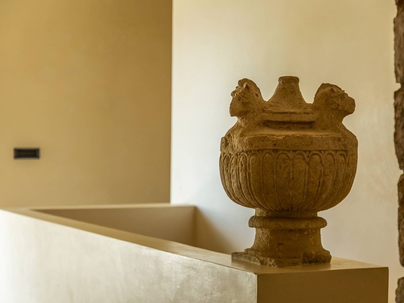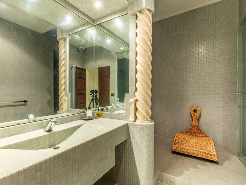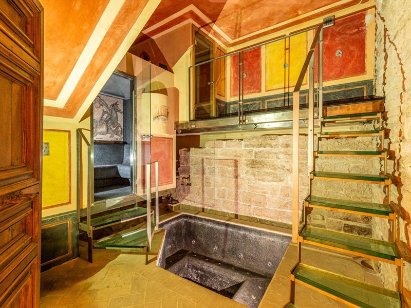Mentre, ben separato da questarea troviamo la zona relax, caratterizzata da Spa con bagno turco, ampia vasca idromassaggio e sauna, sapientemente impreziosita da dipinti e mosaici. Oltre ad un ampio salone le quali volte regalano unatmosfera di autentica bellezza, servito da bagno e locale lavanderia.