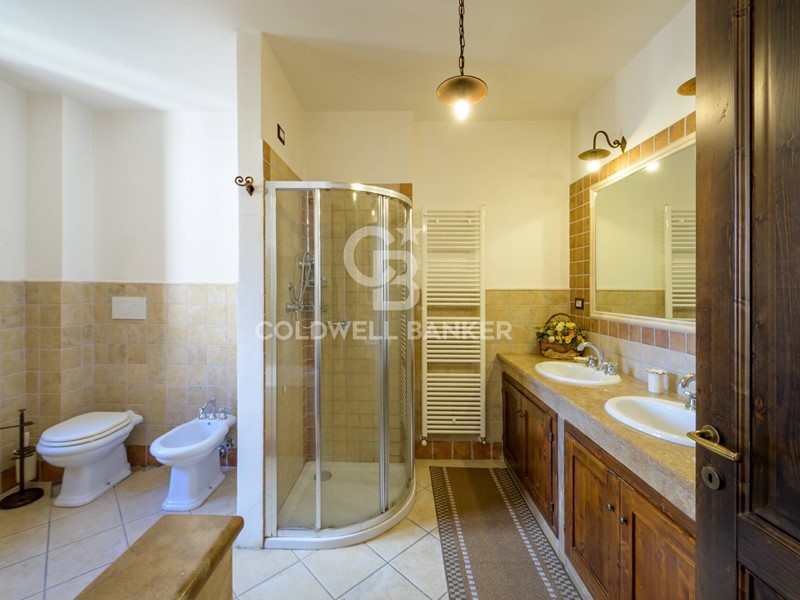Il bagno al secondo piano è dotato di vasca e doccia, arricchito da travertino.